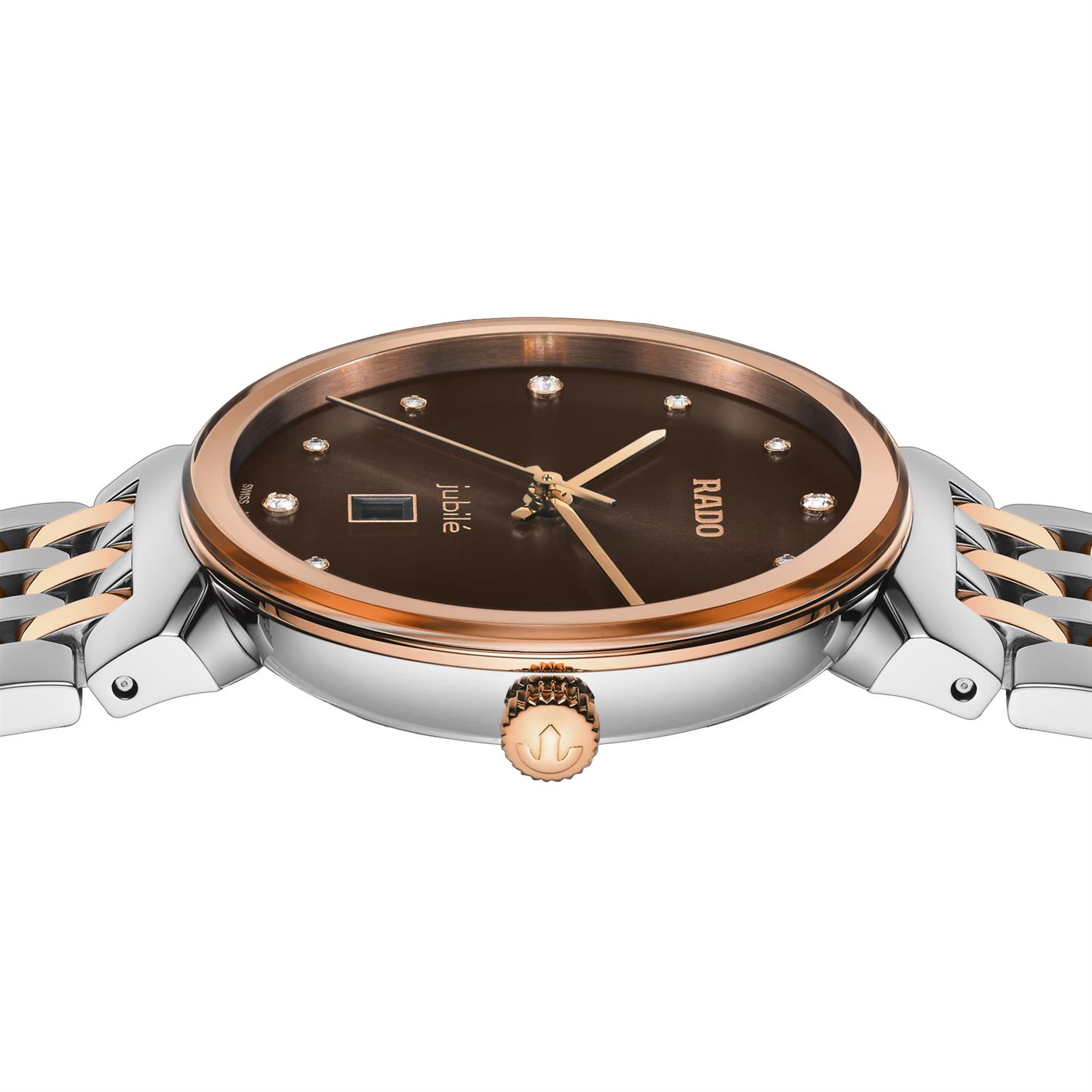 ساعت مچی زنانه رادو Rado با طراحی روزانه بند استیل مسی و قاب استیل مسی با صفحه قهوه ای رنگ مزین به نگین و شیشه ضد خراش با قابلیت داشتن تقویم و موتور سوییسی با انرژی باتری و مقاوم در برابر آب تا عمق 50 متر به همراه گارانتی بین المللی