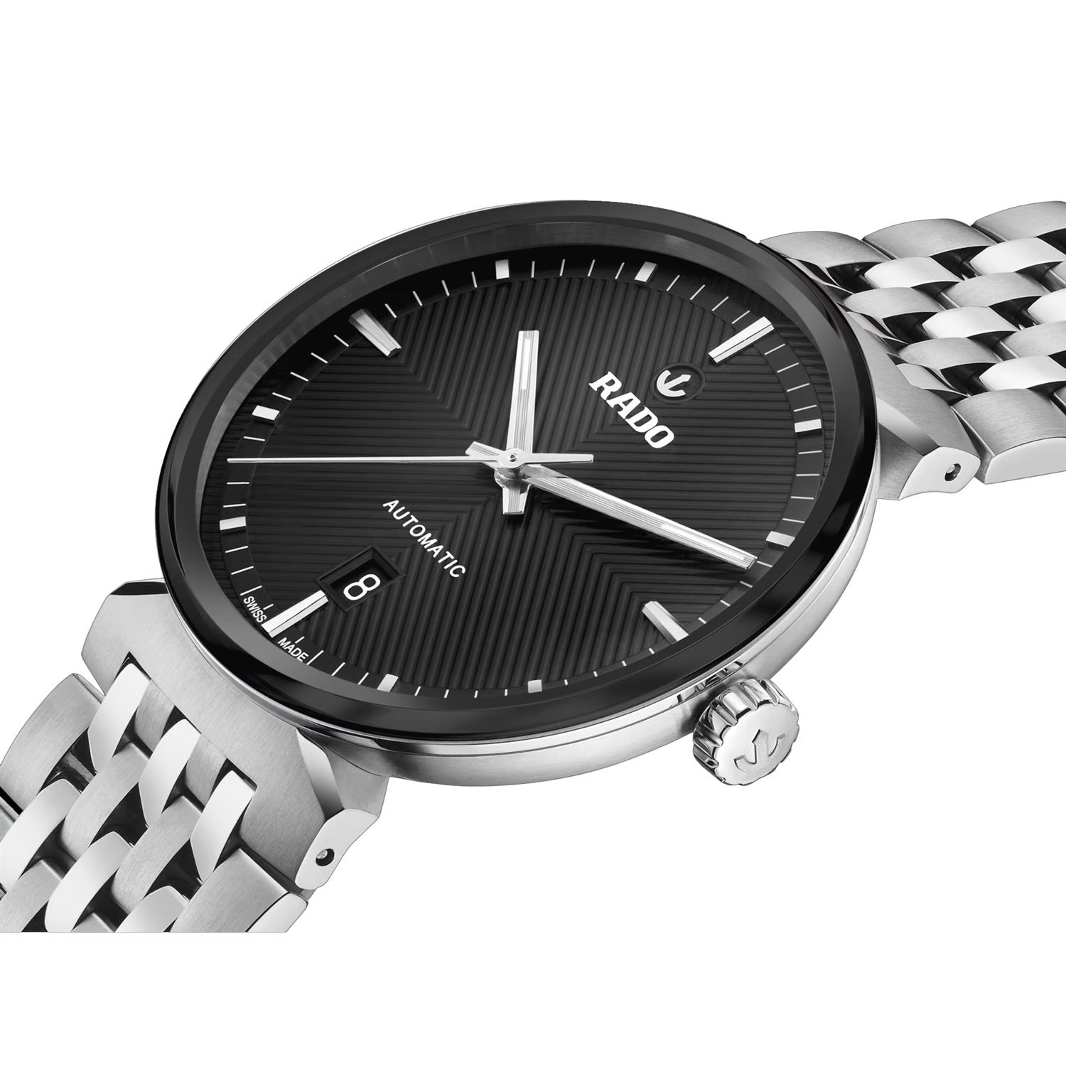 ساعت مچی مردانه رادو RADO با طراحی کلاسیک بند استیل و قاب گرد استیل و صفحه مشکی با قابلیت داشتن تقویم/ شب نما و شیشه ضد خراش و موتور اتوماتیک سوییسی با انرژی مکانیکی و مقاوم در برابر آب تا عمق 50 متر به همراه گارانتی بین المللی