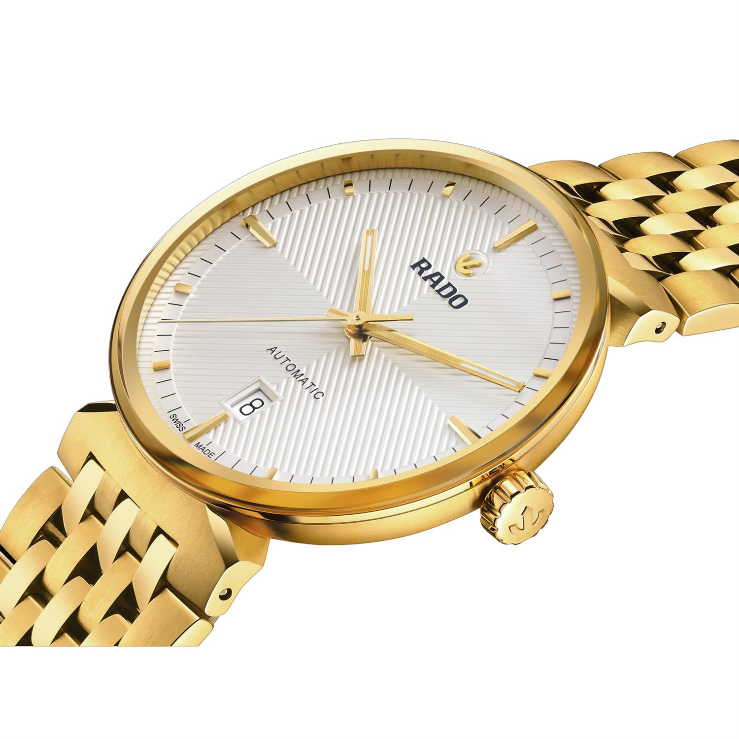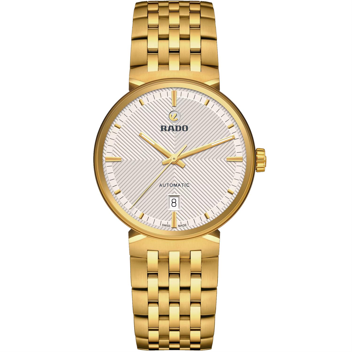ساعت مچی مردانه رادو RADO با طراحی کلاسیک بند فلزی طلایی و قاب گرد طلایی و صفحه سفید با قابلیت داشتن تقویم/ شب نما و شیشه ضد خراش و موتور اتوماتیک سوییسی با انرژی مکانیکی و مقاوم در برابر آب تا عمق 50 متر به همراه گارانتی بین المللی