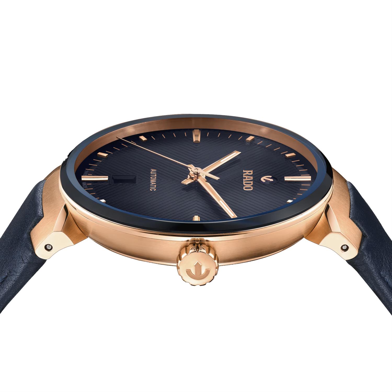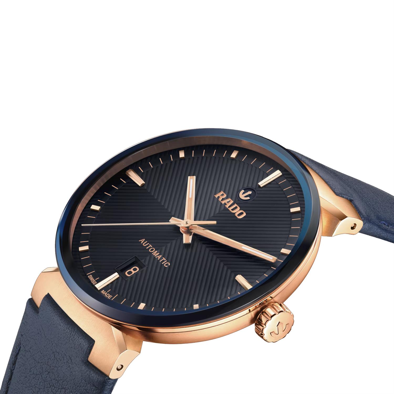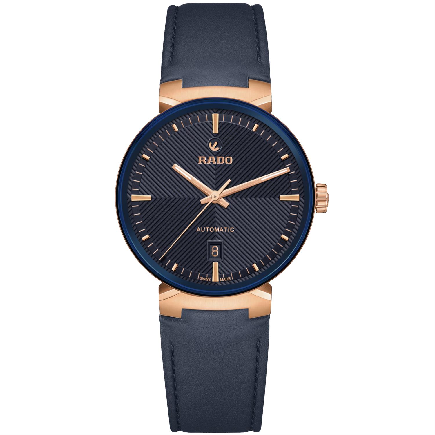 ساعت مچی مردانه رادو RADO با طراحی کلاسیک بند چرمی سرمه ای و قاب سرمه ای مسی و صفحه سرمه ای با قابلیت داشتن تقویم/ شب نما و شیشه ضد خراش و موتور اتوماتیک سوییسی با انرژی مکانیکی و مقاوم در برابر آب تا عمق 50 متر به همراه گارانتی بین المللی