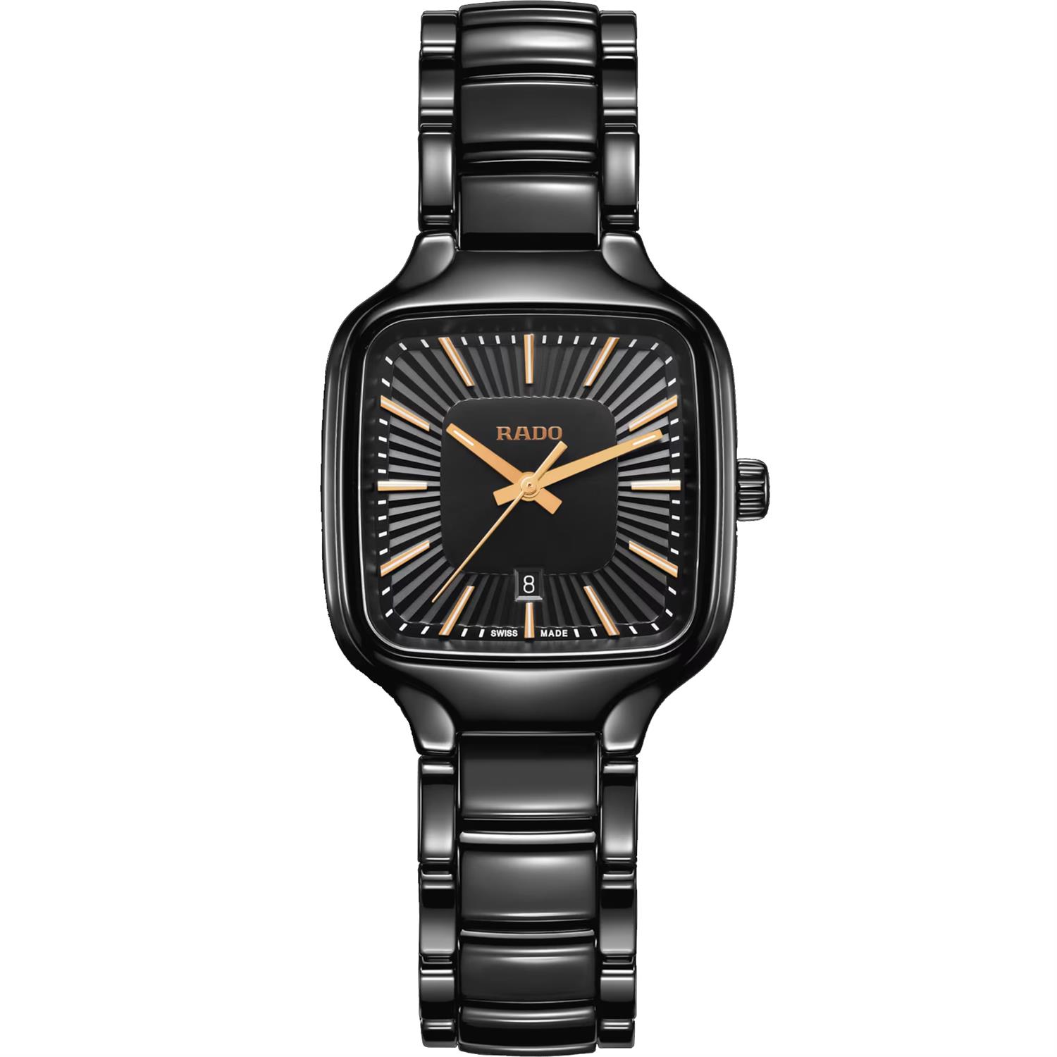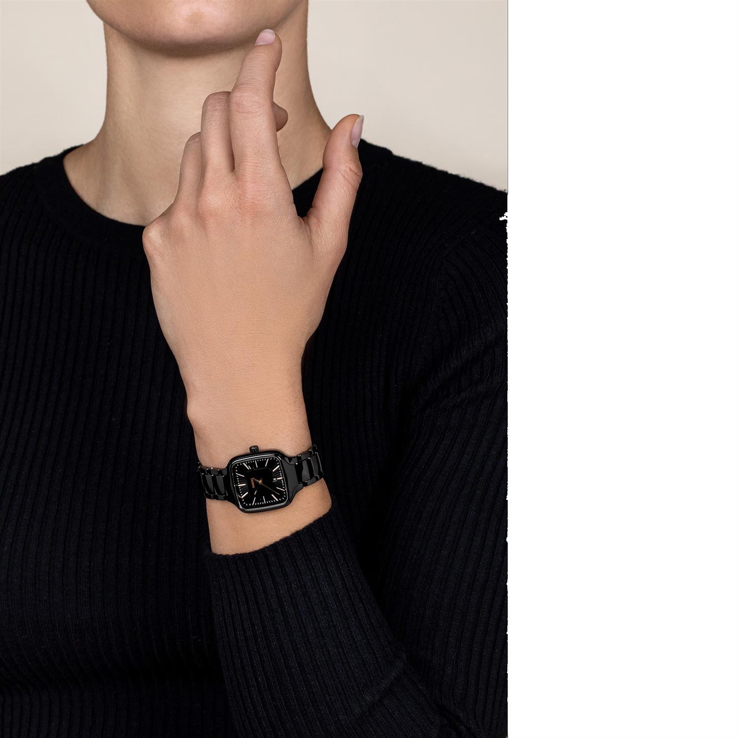 ساعت مچی زنانه رادو RADO با طراحی کلاسیک بند سرامیکی مشکی و قاب مربعی شکل مشکی و صفحه مربع مشکی با قابلیت داشتن تقویم با شیشه ضد خراش و موتور سوییسی با انرژی باتری و مقاوم در برابر آب تا عمق 50 متر به همراه گارانتی بین المللی