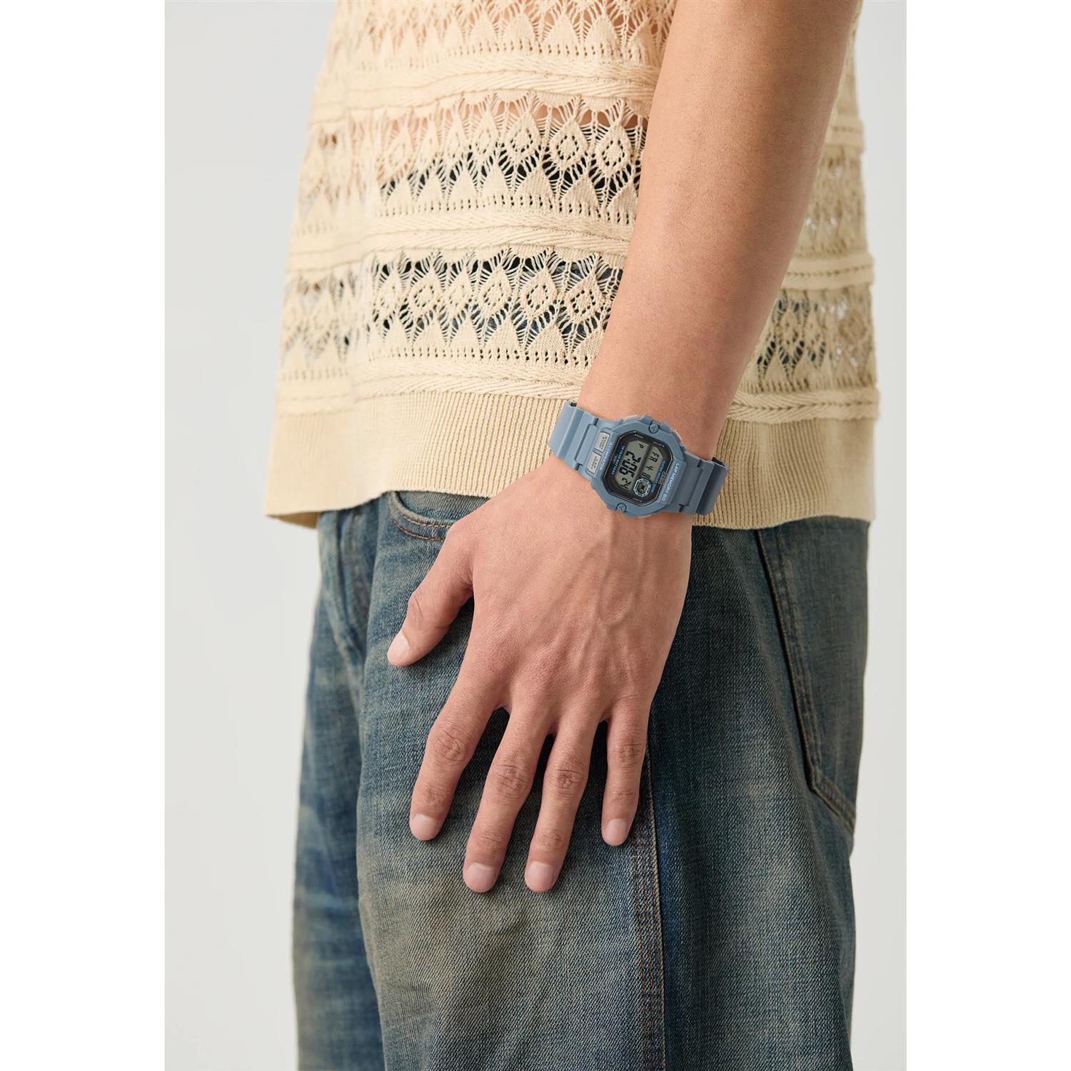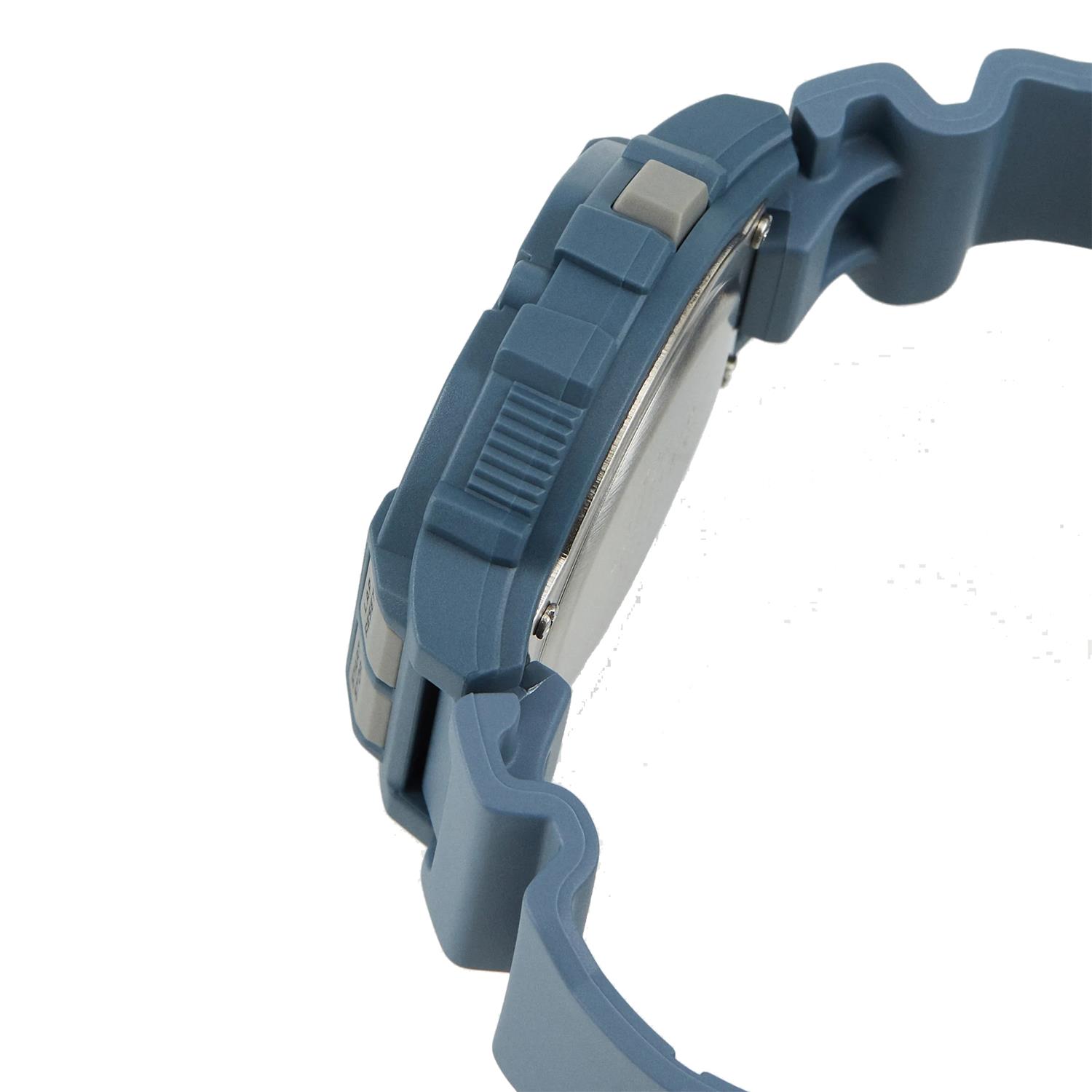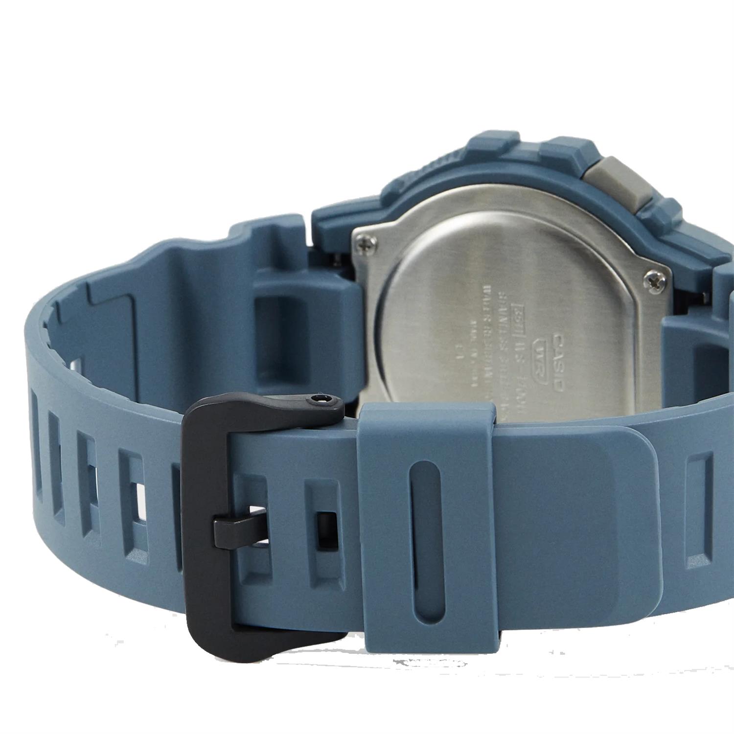 ساعت مچی مردانه کاسیو casio با طراحی روزانه بند سیلیکونی با قاب مربعی آبی و صفحه طوسی مشکی با نمایشگر دیجیتالی و قابلیت کرنوگراف روزهای هفته روز و شب نور پشت صفحه زنگ هشدار تایمر شمارش معکوس و موتور 10 سال باتری  ژاپنی و مقاوم در برابر آب تا عمق 100 متر به همراه گارانتی بین المللی