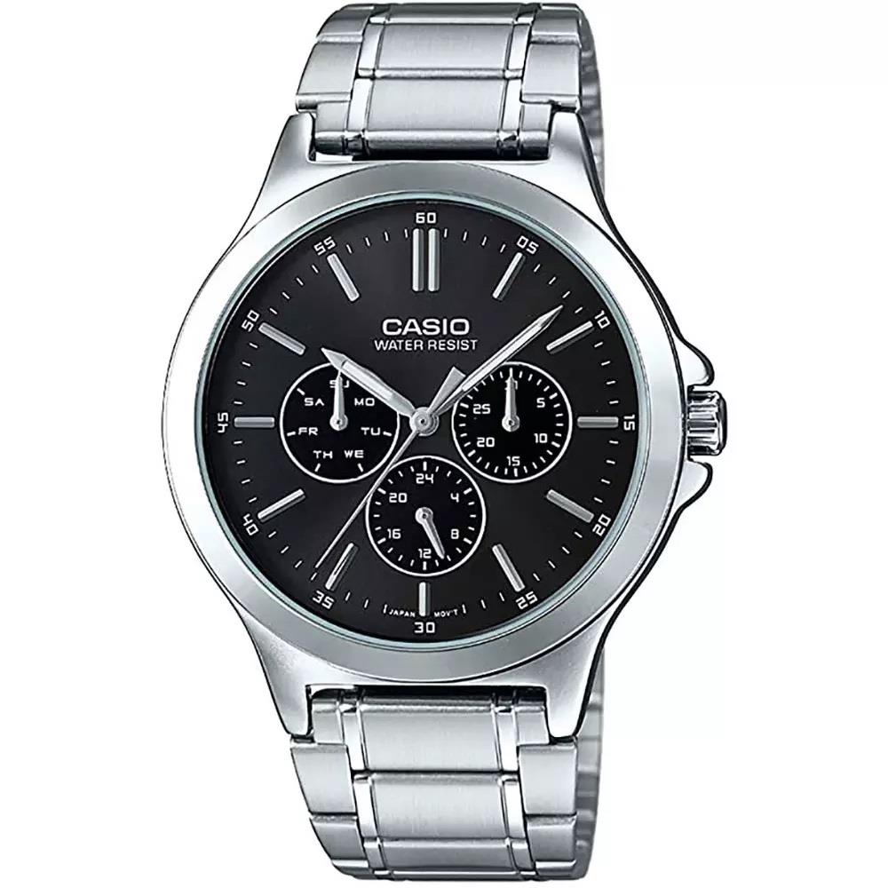 ساعت مچی مردانه کاسیو casio با طراحی روزانه بند استیل با قاب گرد نقره ای و صفحه گرد مشکی با قابلیت داشتن تقویم / روزهای هفته/ روزوشب / شب نما و موتور ژاپنی با انرژی باتری و مقاوم در برابر آب تا عمق 30 متربه همراه گارانتی بین المللی