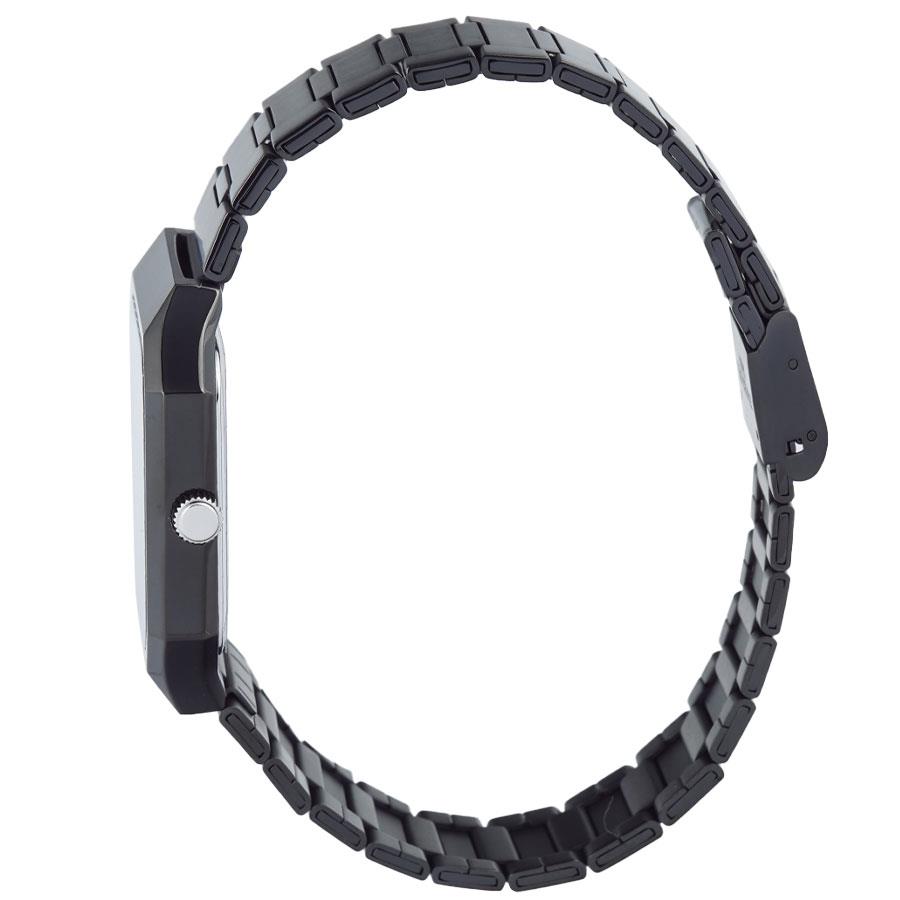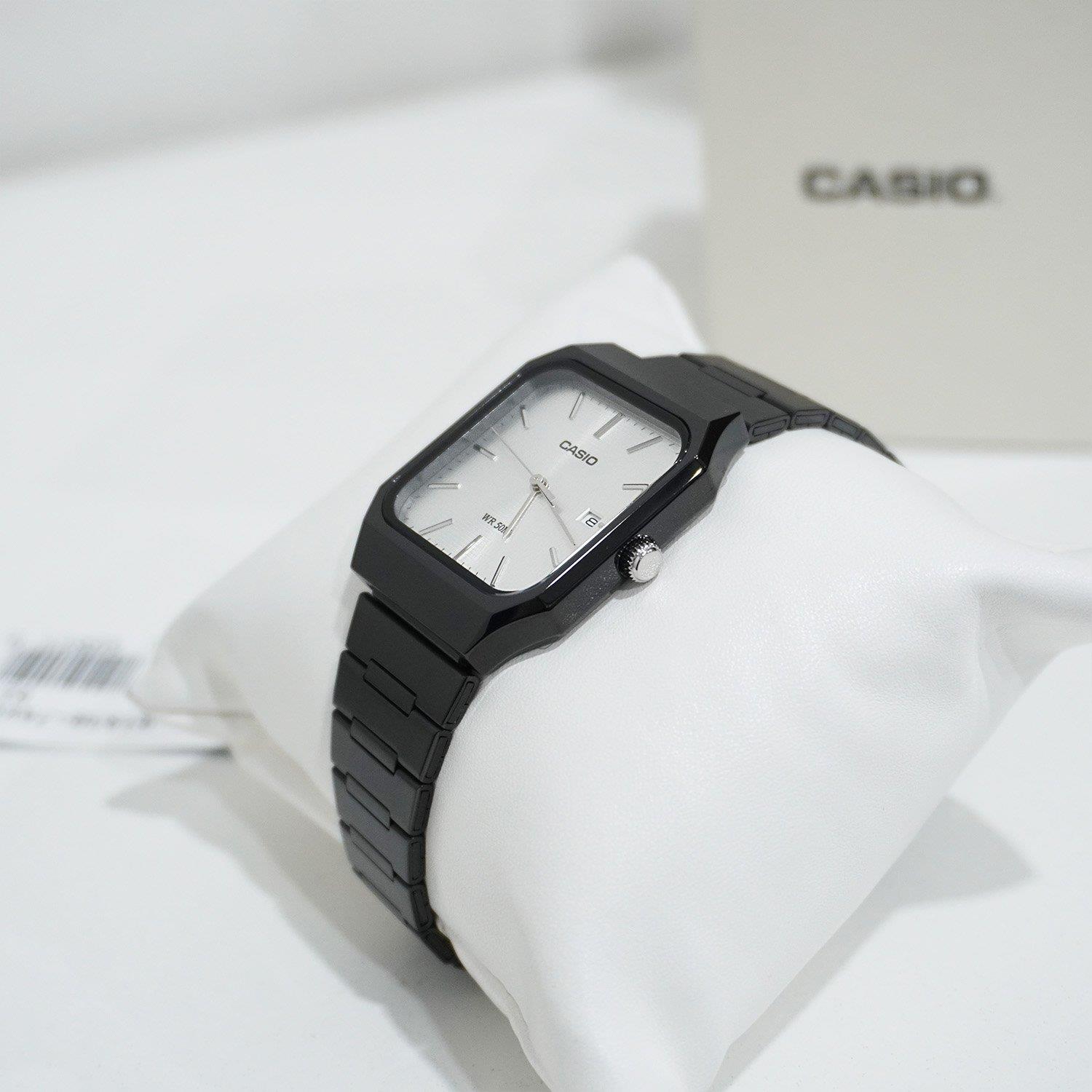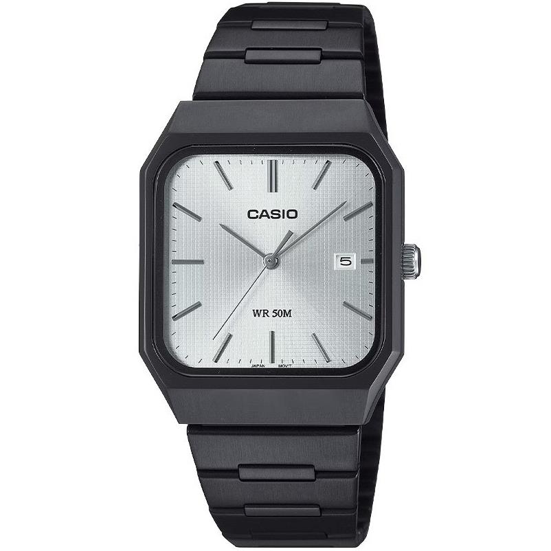 ساعت مچی مردانه کاسیو casio با طراحی روزانه بند فلزی مشکی با قاب مشکی و صفحه  نقره ای و قابلیت تقویم و موتور ژاپنی با اترژی باتری و مقاوم در برابر آب تا عمق 50 متر به همراه گارانتی بین المللی