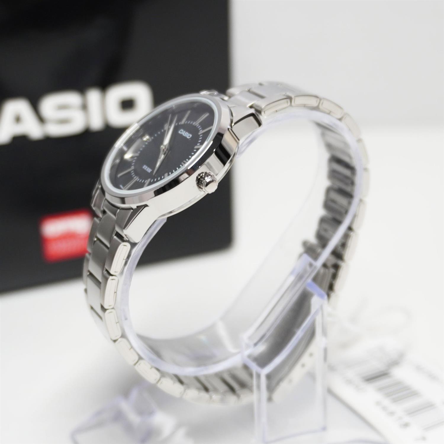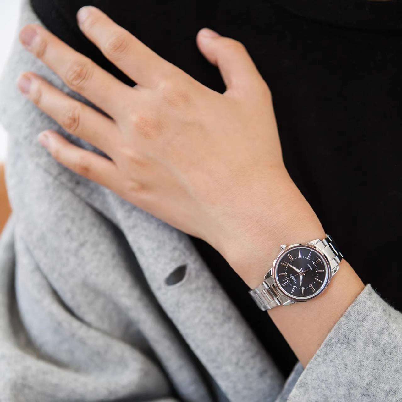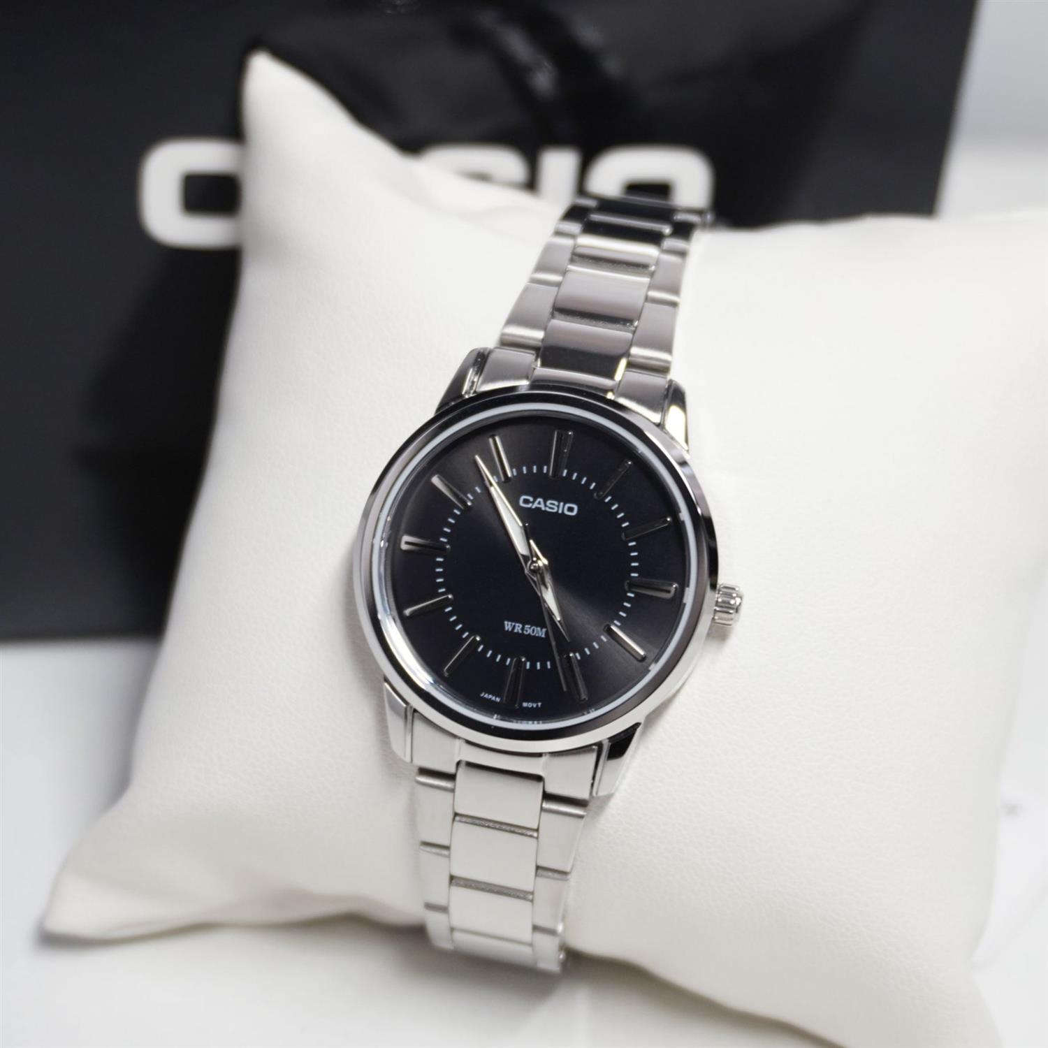 ساعت مچی زنانه کاسیو casio با طراحی روزانه بند استیل با قاب گرد نقره ای و صفحه گرد مشکی با قالبیت داشتن شب نما و موتور ژاپنی با انرژی باتری و مقاوم در برابر آب تا عمق 50 متر به همراه گارانتی بین المللی