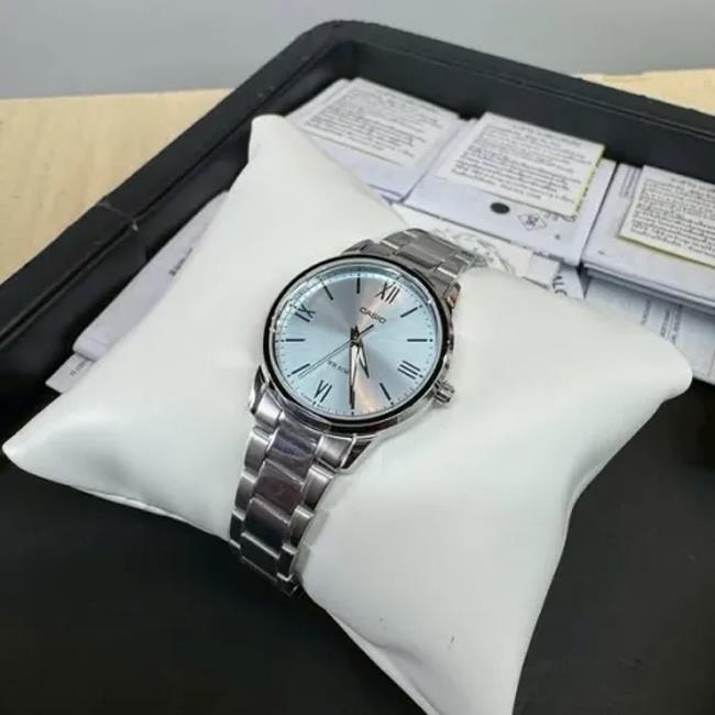 ساعت مچی زنانه کاسیو casio با طراحی روزانه بند استیل با قاب گرد فلزی و صفحه گرد آبی با قابلیت داشتن شب نما و موتور ژاپنی با انرژی باتری و مقاوم در برابر آب تا عمق 50 متر به همراه گارانتی بین المللی