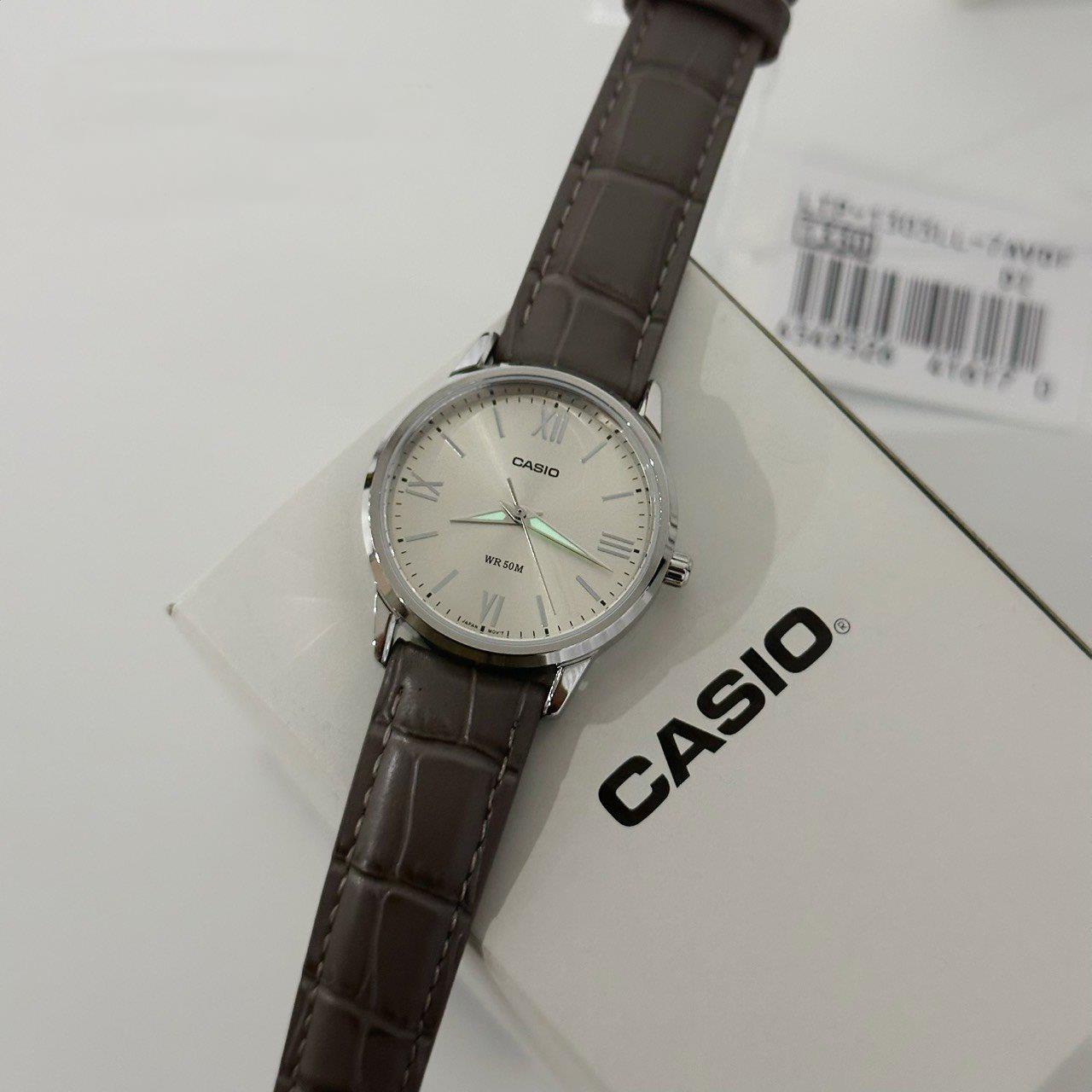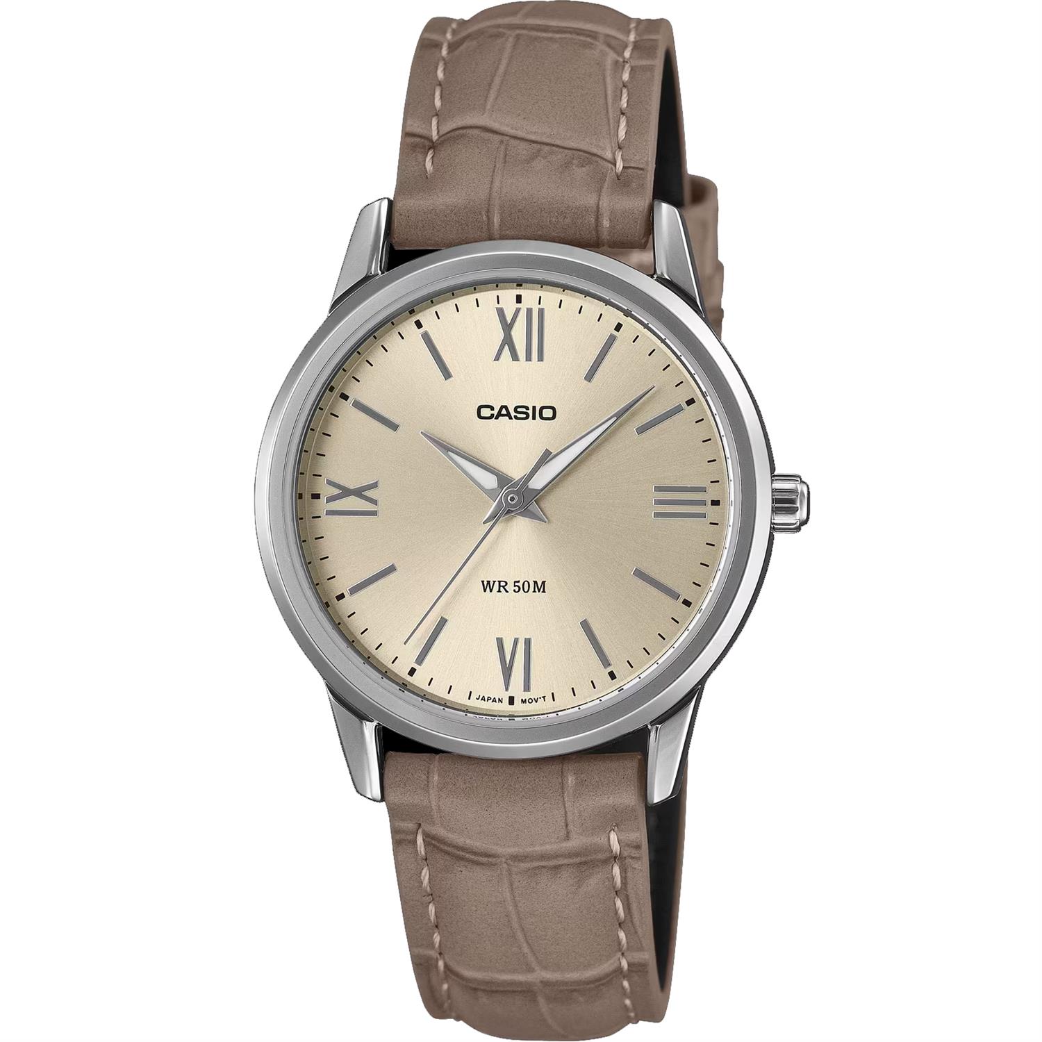 ساعت مچی زنانه کاسیو casio با طراحی روزانه بند چرمی قهوه ای با قاب گرد نقره ای و صفحه گرد بژ و موتور ژاپنی با انرژی باتری و مقاوم در برابر آب تا عمق 50 متر به همراه گارانتی بین المللی