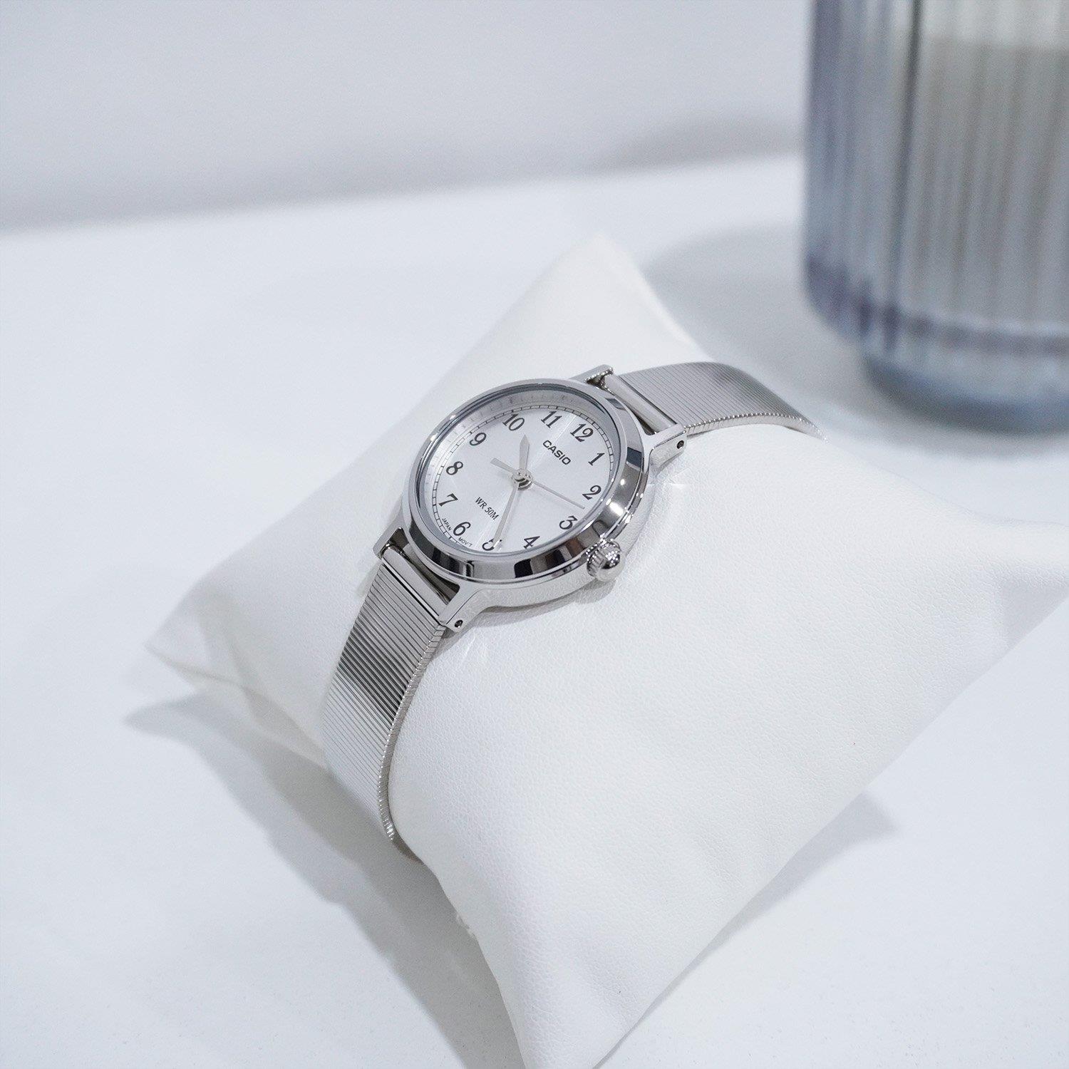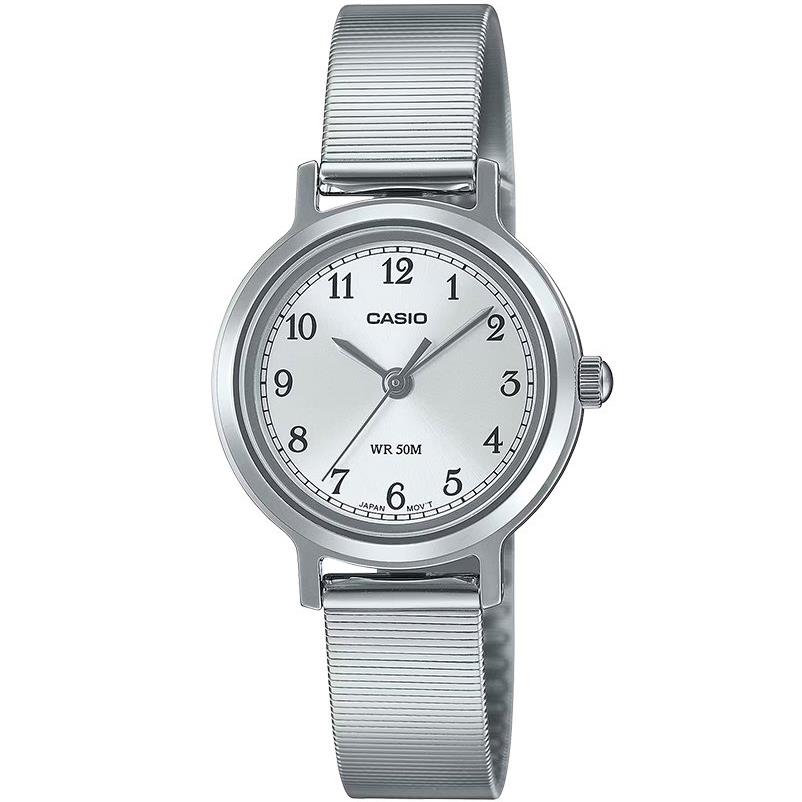 ساعت مچی زنانه کاسیو casio با طراحی روزانه بند استیل با قاب گرد استیل و صفحه نقره ای و موتور ژاپنی با انرژی باتری و مقاوم در برابر آب تا عمق 50 متر به همراه گارانتی بین المللی
