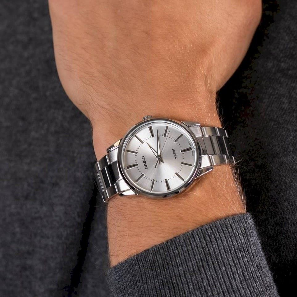 ساعت مچی مردانه کاسیو casio با طراحی روزانه بند استیل با قاب گرد نقره ای و صفحه گرد نقره ای با قابلیت داشتن شب نما و موتور ژاپنی با انرژی باتری و مقاوم در برابر آب تا عمق 50 متر به همراه گارانتی بین المللی