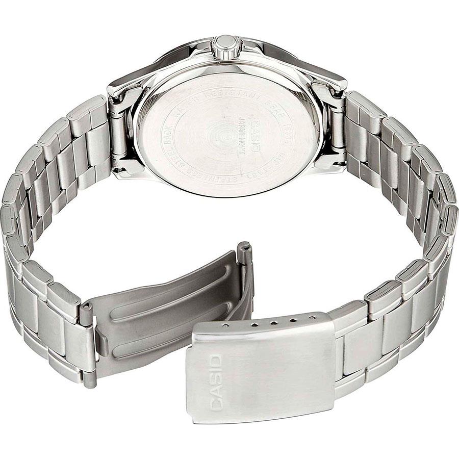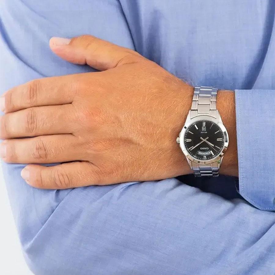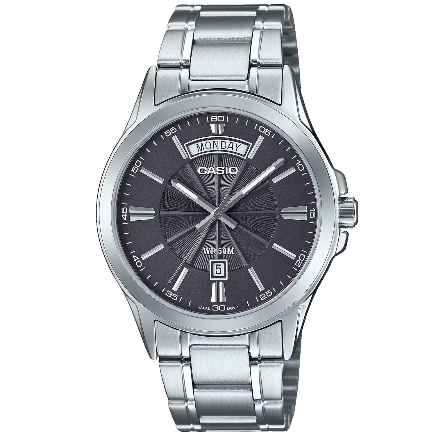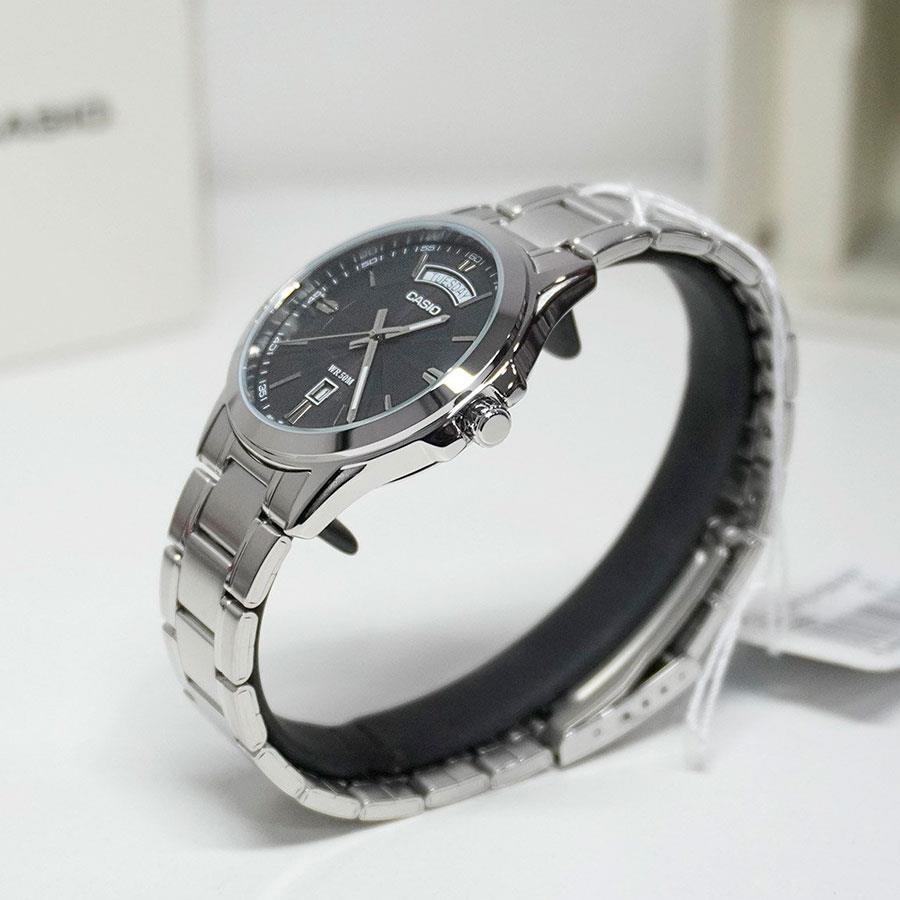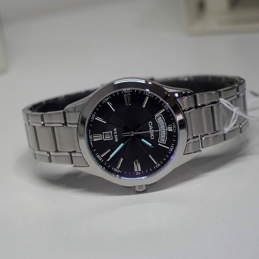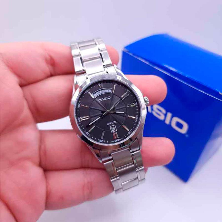 ساعت مچی مردانه کاسیو casio با طراحی روزانه بند استیل با قاب گرد نقره ای و صفحه گرد مشکی با قابلیت داشتن تقویم / شب نما / روزهای هفته و موتور ژاپنی با انرژی باتری و مقاوم در برابر آب تا عمق 50 متر به همراه گارانتی بین المللی
