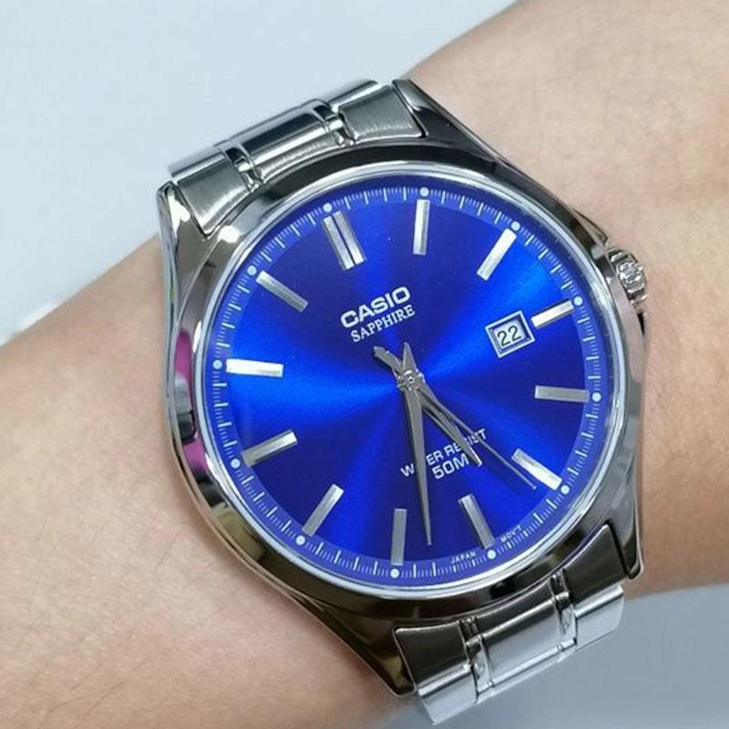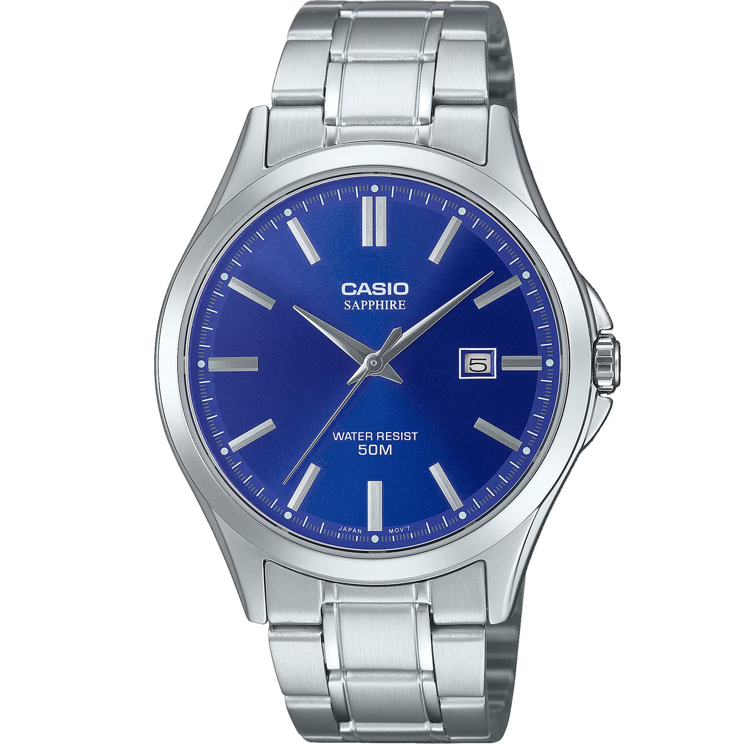 ساعت مچی مردانه کاسیو casio با طراحی روزانه بند استیل با قاب گرد استیل و صفحه گرد سرمه ای با شیشه ضد خراش و قابلیت داشتن تقویم و موتور ژاپنی با انرژی باتری و مقاوم در برابر آب تا عمق 50 متر به همراه گارانتی بین المللی