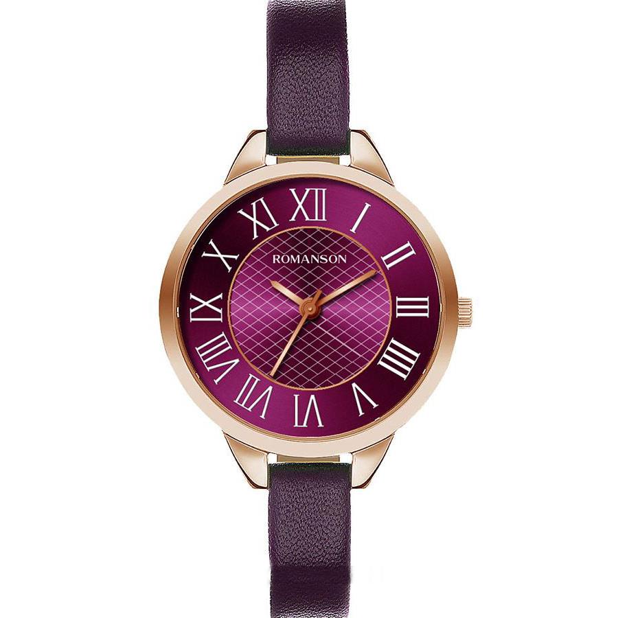 ساعت مچی زنانه رومانسون ROMANSON با طراحی روزانه بند چرمی بنفش با قاب گرد مسی و صفحه بنفش و موتور سوییسی با انرژی باطری و مقاوم در برابر آب تا عمق 30 متر به همراه دو سال گارانتی بین المللی