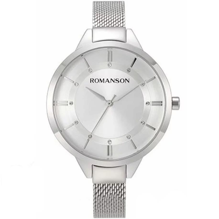 ساعت مچی زنانه رومانسون ROMANSON با طراحی روزانه بند حصیربافت استیل با قاب گرد استیل و صفحه نگین دار نقره ای و موتور سوییسی با انرژی باطری و مقاوم در برابر آب تا عمق 30 متر به همراه دو سال گارانتی بین المللی