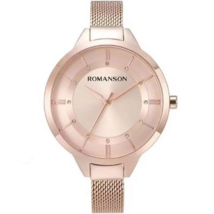 ساعت مچی زنانه رومانسون ROMANSON با طراحی روزانه بند حصیربافت مسی با قاب گرد مسی و صفحه نگین دار مسی و موتور سوییسی با انرژی باطری و مقاوم در برابر آب تا عمق 30 متر به همراه دو سال گارانتی بین المللی