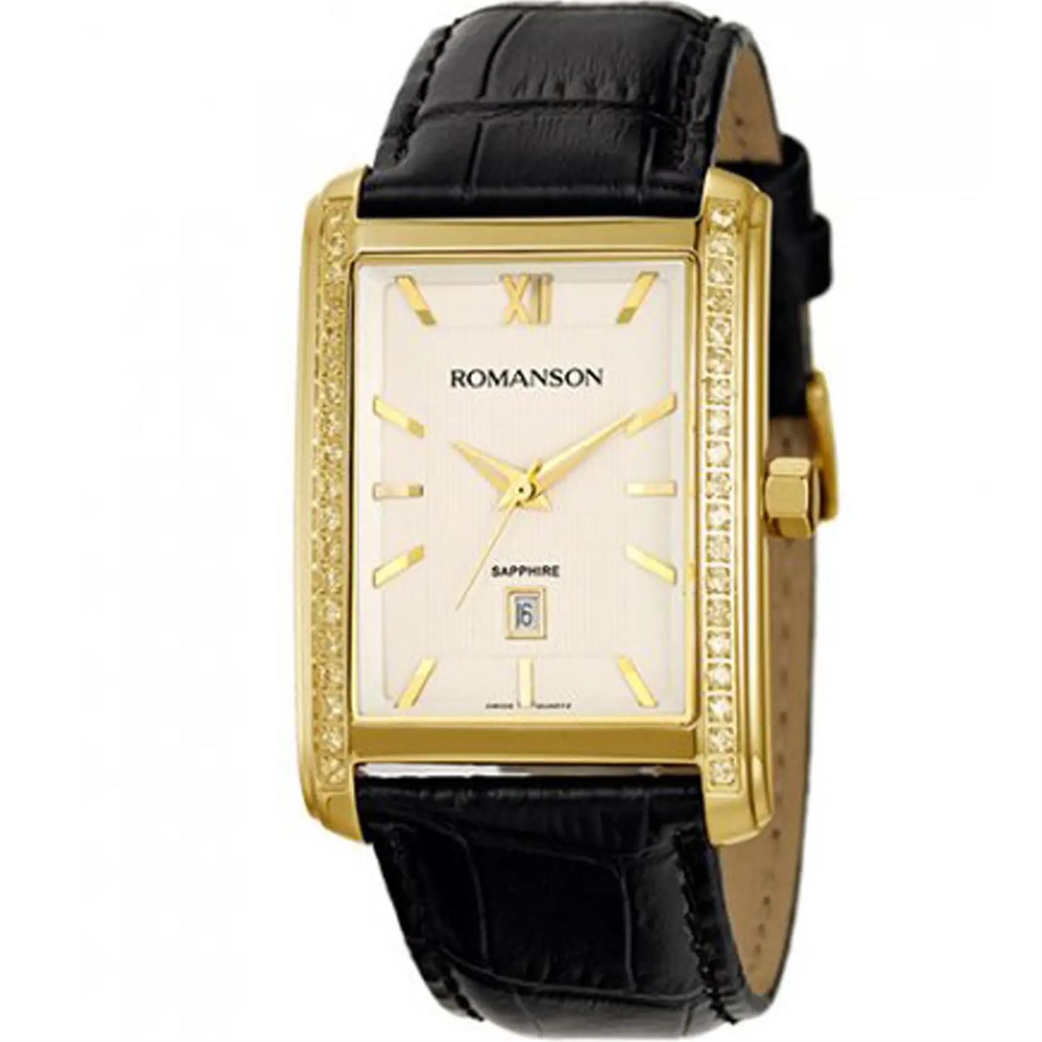 ساعت مچی زنانه رومانسون ROMANSON با طراحی اسپرت بند چرمی مشکی با قاب نگین دار طلایی و صفحه کرم با شیشه ضد خراش و موتور سوییسی با انرژی باطری و قابلیت داشتن تقویم  و مقاوم در برابر آب تا عمق 30 متر به همراه دو سال گارانتی بین المللی