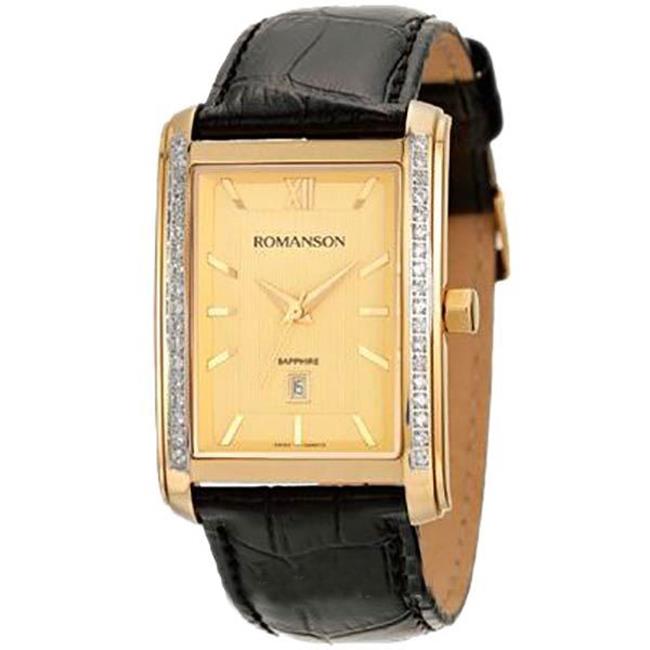 ساعت مچی زنانه رومانسون ROMANSON با طراحی اسپرت بند چرمی مشکی با قاب نگین دار طلایی و صفحه طلایی با شیشه ضد خراش و موتور سوییسی با انرژی باطری و قابلیت داشتن تقویم  و مقاوم در برابر آب تا عمق 30 متر به همراه دو سال گارانتی بین المللی