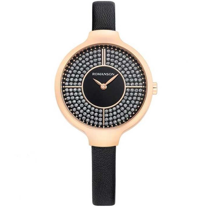 ساعت مچی زنانه رومانسون ROMANSON با طراحی روزانه بند چرمی با قاب فلزی مسی و صفحه نگین دار مشکی و موتور سوییسی با انرژی باطری و مقاوم در برابر آب تا عمق 30 متر به همراه دو سال گارانتی بین المللی