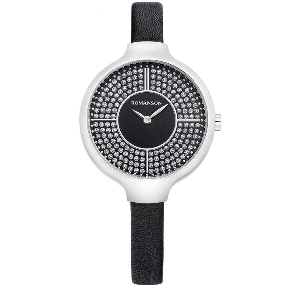 ساعت مچی زنانه رومانسون ROMANSON با طراحی روزانه بند چرمی با قاب استیل و صفحه نگین دار مشکی و موتور سوییسی با انرژی باطری و مقاوم در برابر آب تا عمق 30 متر به همراه دو سال گارانتی بین المللی