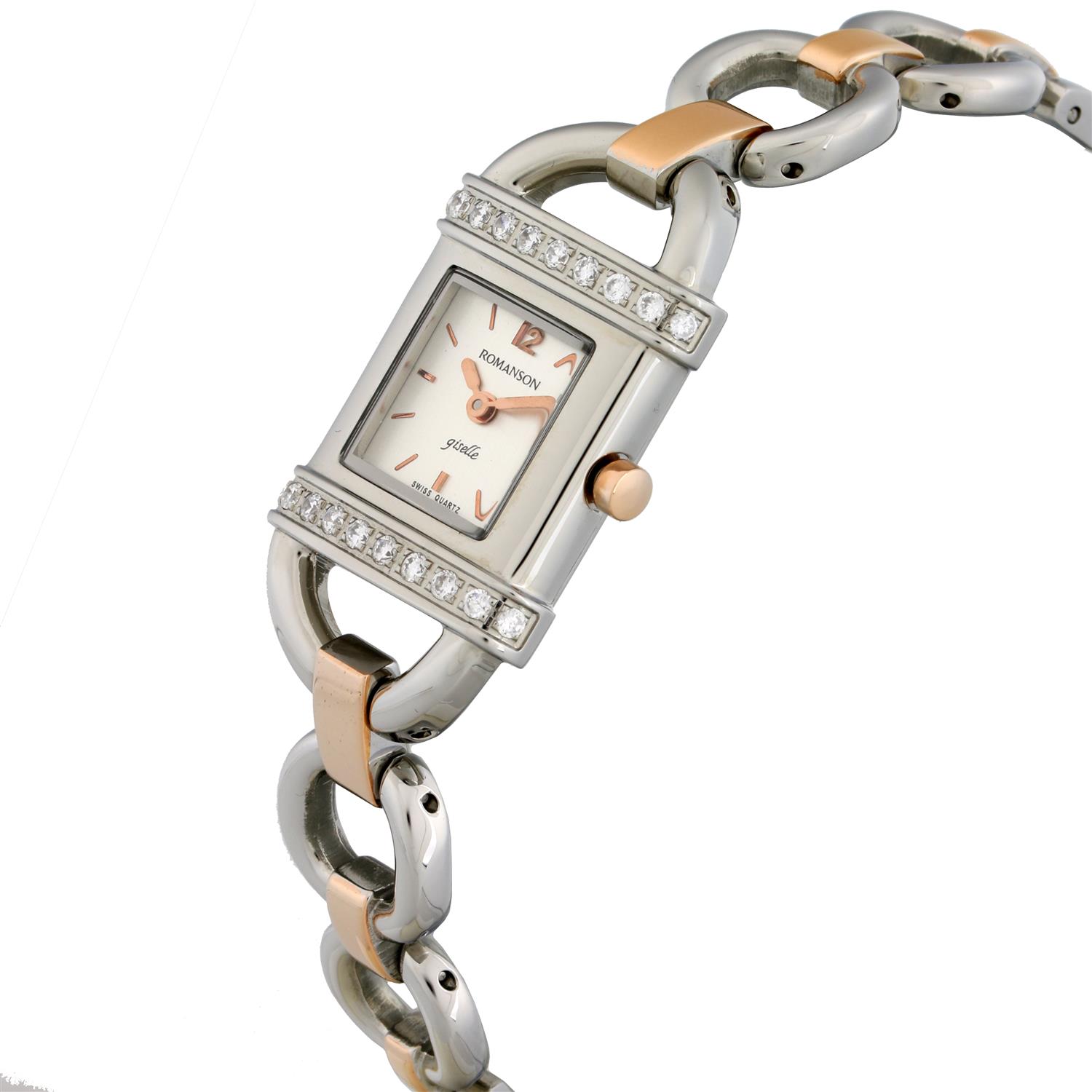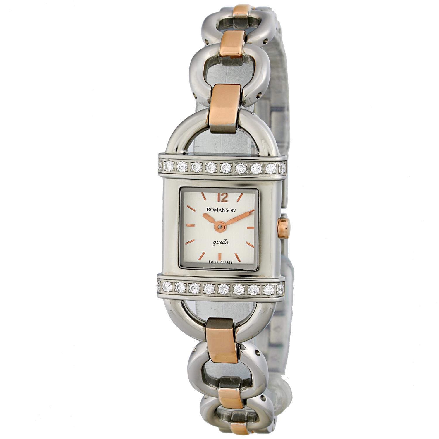 ساعت مچی زنانه رومانسون ROMANSON با طراحی روزانه بند استیل مسی با قاب دور نگین استیل وصفحه مربعی شکل سفید و موتور سوییسی با انرژی باطری و مقاوم در برابر آب تا عمق 30 متر به همراه دو سال گارانتی بین المللی