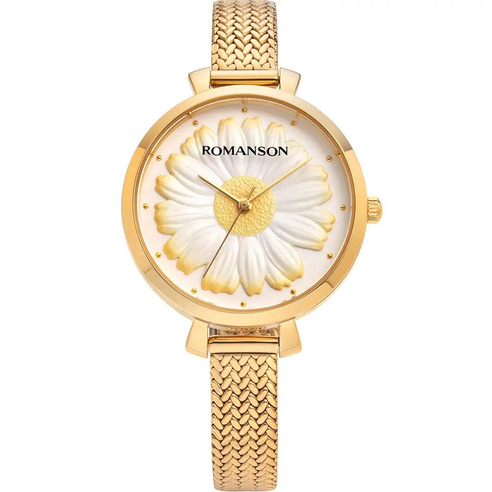 ساعت مچی زنانه رومانسون ROMANSON با طراحی روزانه بند حصیر بافت طلایی با قاب فلزی طلایی و صفحه طلایی سفید و موتور سوییسی با انرژی باطری و مقاوم در برابر آب تا عمق 30 متر به همراه دو سال گارانتی بین المللی