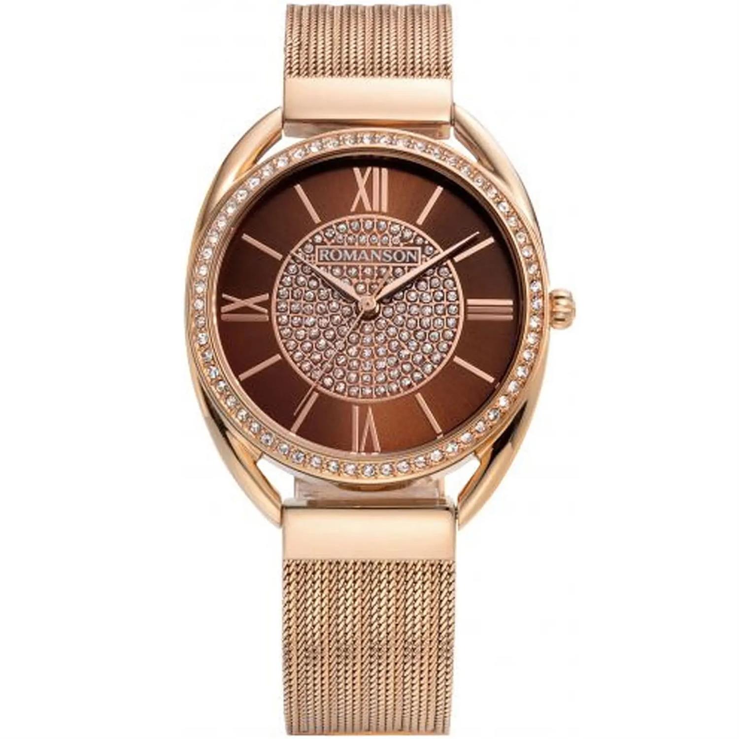 ساعت مچی زنانه رومانسون ROMANSON با طراحی روزانه بند حصیر بافت مسی با قاب نگین دار مسی و صفحه نگین دار قهوه ای و موتور سوییسی با انرژی باطری و مقاوم در برابر آب تا عمق 30 متر به همراه دو سال گارانتی بین المللی