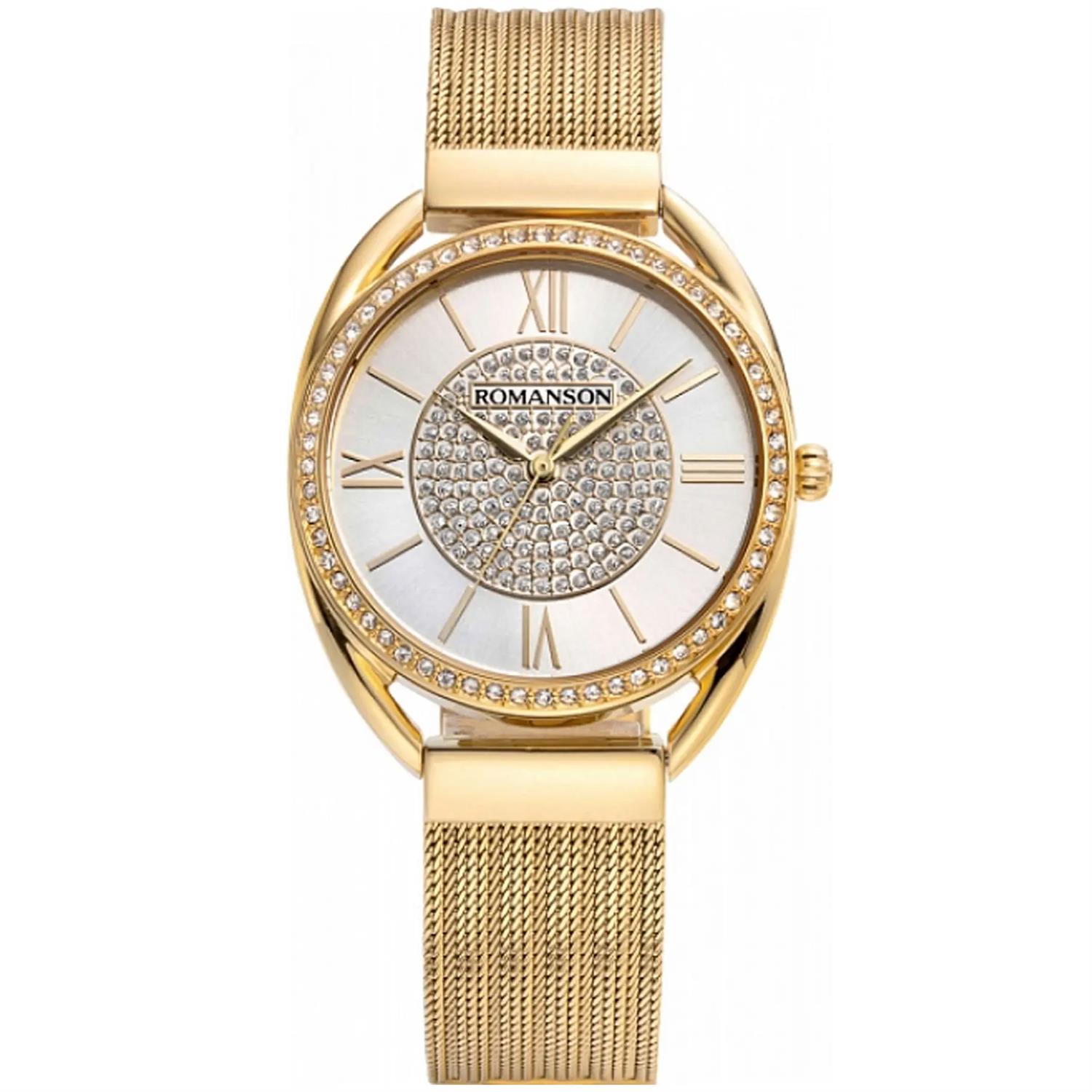 ساعت مچی زنانه رومانسون ROMANSON با طراحی روزانه بند حصیر بافت طلایی با قاب نگین دار طلایی و صفحه نگین دار نقره ای و موتور سوییسی با انرژی باطری و مقاوم در برابر آب تا عمق 30 متر به همراه دو سال گارانتی بین المللی