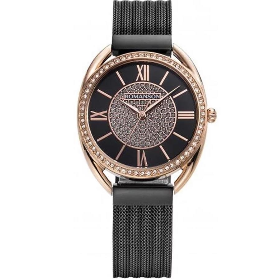 ساعت مچی زنانه رومانسون ROMANSON با طراحی روزانه بند حصیر بافت مشکی با قاب نگین دار مسی  و صفحه نگین دار مشکی و موتور سوییسی با انرژی باطری و مقاوم در برابر آب تا عمق 30 متر به همراه دو سال گارانتی بین المللی