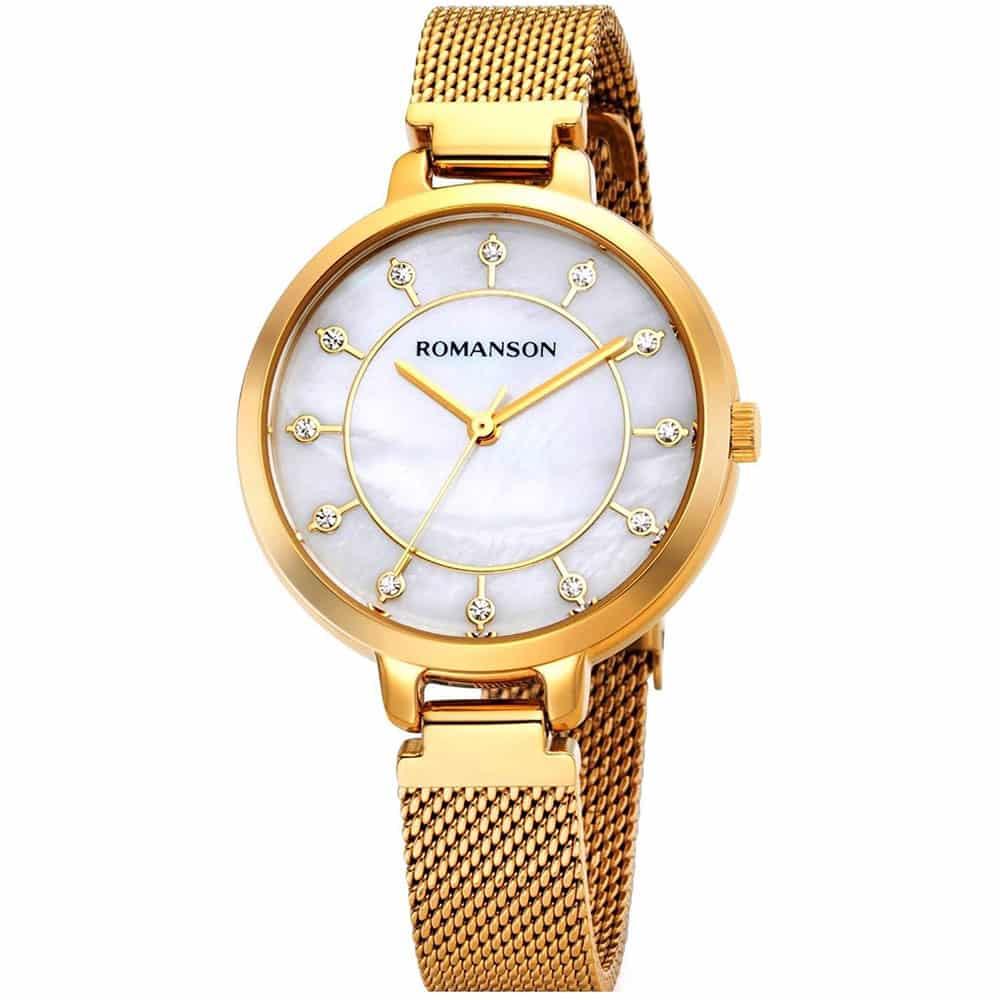 ساعت مچی زنانه رومانسون ROMANSON با طراحی روزانه بند حصیر بافت طلایی با قاب گرد طلایی و صفحه نگین دار سفید صدفی و موتور سوییسی با انرژی باطری و مقاوم در برابر آب تا عمق 30 متر به همراه دو سال گارانتی بین المللی