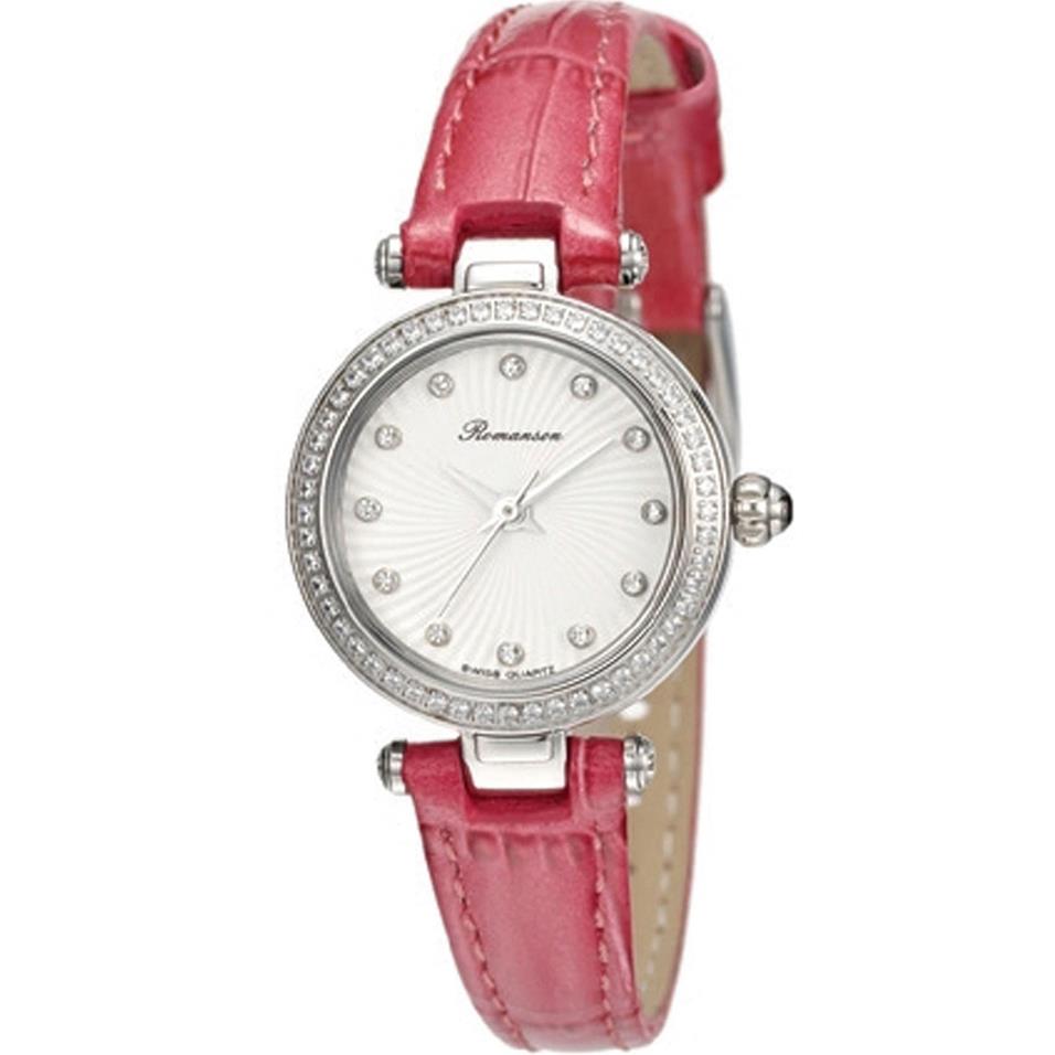 ساعت مچی زنانه رومانسون ROMANSON با طراحی روزانه بند چرمی قرمز با قاب نگین دار مسی و صفحه نگین دار سفید و موتور سوییسی با انرژی باطری و مقاوم در برابر آب تا عمق 30 متر به همراه دو سال گارانتی بین المللی