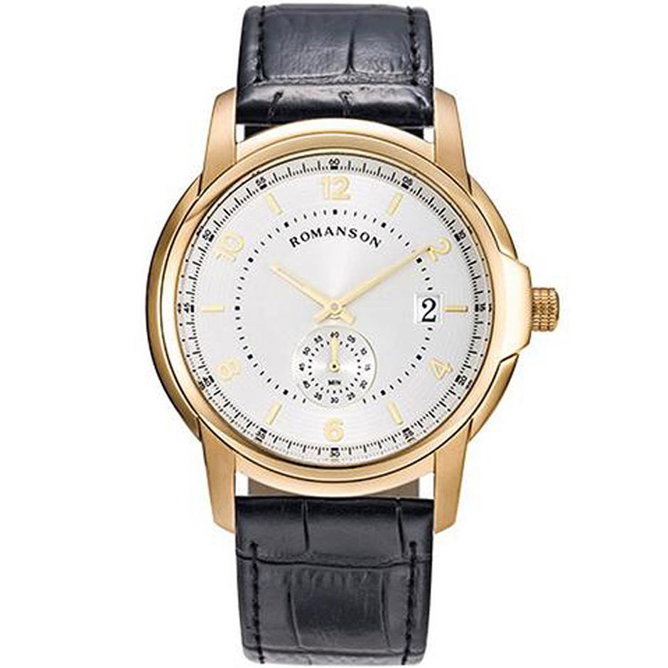 ساعت مچی مردانه رومانسون ROMANSON با طراحی روزانه بند چرمی با قاب فلزی طلایی و صفحه گرد نقره ای و موتور سوییسی با انرژی باتری/ قابلیت داشتن تقویم زیر ثانیه و مقاوم در برابر آب تا عمق 30 متر به همراه دو سال گارانتی بین المللی