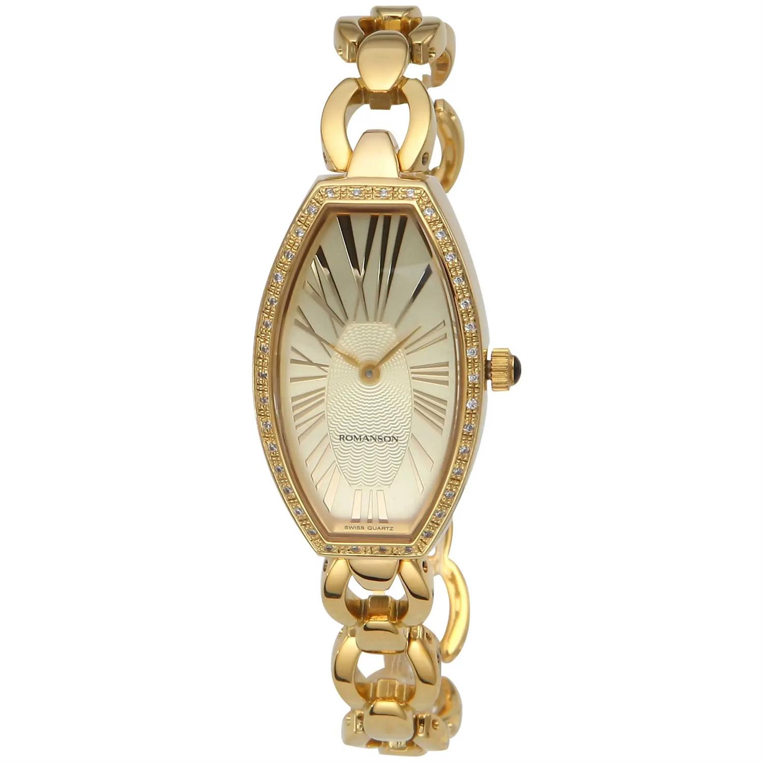 ساعت مچی زنانه رومانسون ROMANSON با طراحی روزانه طلایی رنگ با بند فلزی با قاب دور نگین و موتور سوییسی با انرژی باطری و مقاوم در برابر آب تا عمق 30 متر به همراه دو سال گارانتی بین المللی