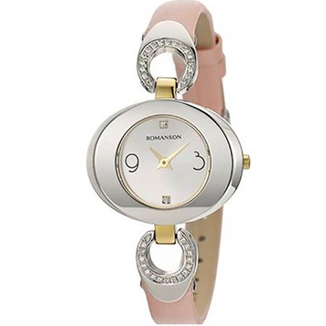 ساعت مچی زنانه رومانسون ROMANSON با طراحی روزانه بند چرمی صورتی با قاب نگین دار فلزی و صفحه نگین دار نقره ای و موتور سوییسی با انرژی باطری و مقاوم در برابر آب تا عمق 30 متر به همراه دو سال گارانتی بین المللی