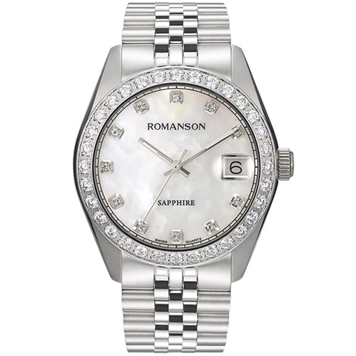 ساعت مچی مردانه رومانسون ROMANSON با طراحی اسپرت بند استیل و قاب دور نگین استیل و صفحه نگین دار سفید صدفی با شیشه ضد خراش  و موتور سوییسی با انرژی باطری و قابلیت داشتن شب نما / تقویم و مقاوم در برابر آب تا عمق 30 متر به همراه دو سال گارانتی بین المللی