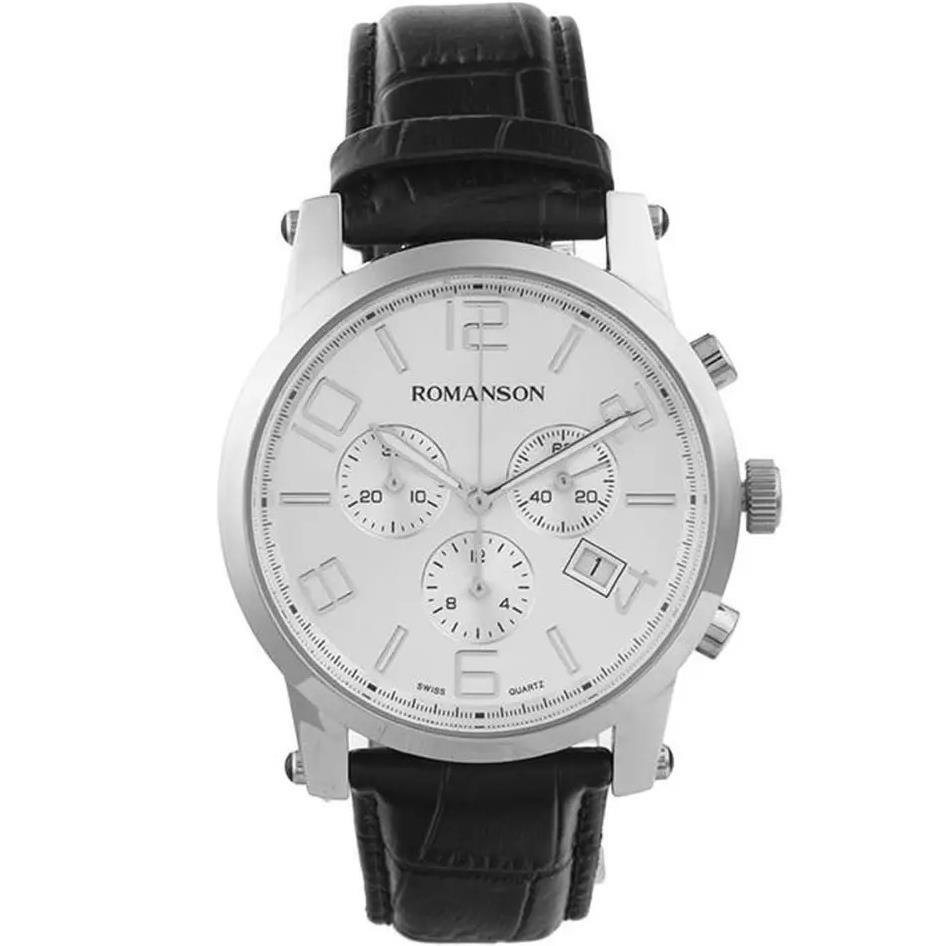 ساعت مچی مردانه رومانسون ROMANSON با طراحی اسپرت بند چرمی مشکی و قاب گرد استیل و صفحه نقره ای و موتور سوییسی با انرژی باطری و قابلیت داشتن شب نما / تقویم / کرنوگراف و مقاوم در برابر آب تا عمق 30 متر به همراه دو سال گارانتی بین المللی