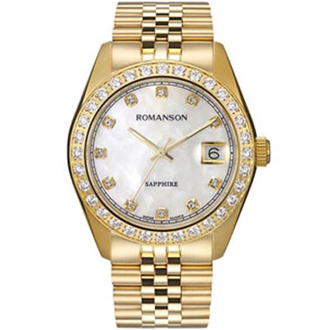 ساعت مچی مردانه رومانسون ROMANSON با طراحی اسپرت بند فلزی طلایی و قاب دور نگین طلایی و صفحه نگین دارسفید صدفی با شیشه ضد خراش  و موتور سوییسی با انرژی باطری و قابلیت داشتن شب نما / تقویم و مقاوم در برابر آب تا عمق 30 متر به همراه دو سال گارانتی بین المللی