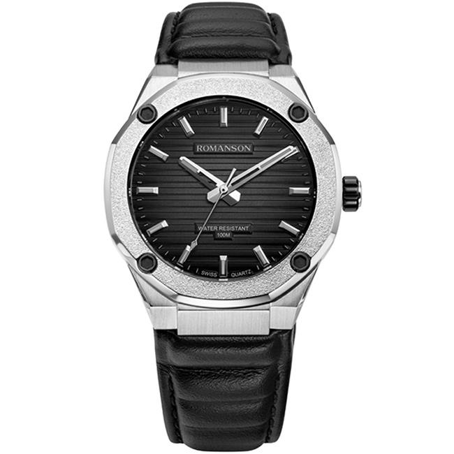 ساعت مچی مردانه رومانسون ROMANSON با طراحی اسپرت بند چرمی مشکی با قاب متفاوت استیل و صفحه گرد مشکی با شیشه ضد خراش  و موتور سوییسی با انرژی باطری و قابلیت داشتن شب نما و مقاوم در برابر آب تا عمق 100 متر به همراه دو سال گارانتی بین المللی