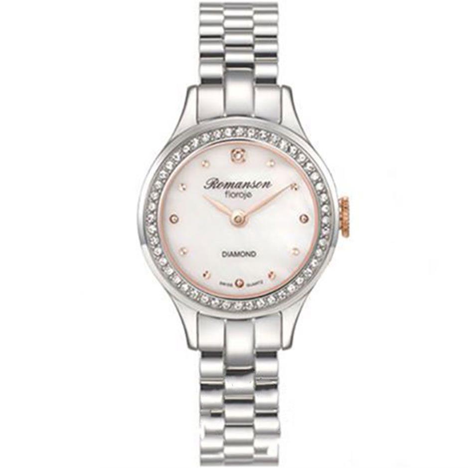 ساعت مچی زنانه رومانسون ROMANSON با طراحی روزانه بند فلزی با قاب دور نگین استیل و صفحه نگین دار سفید و موتور سوییسی با انرژی باطری و مقاوم در برابر آب تا عمق 30 متر به همراه دو سال گارانتی بین المللی