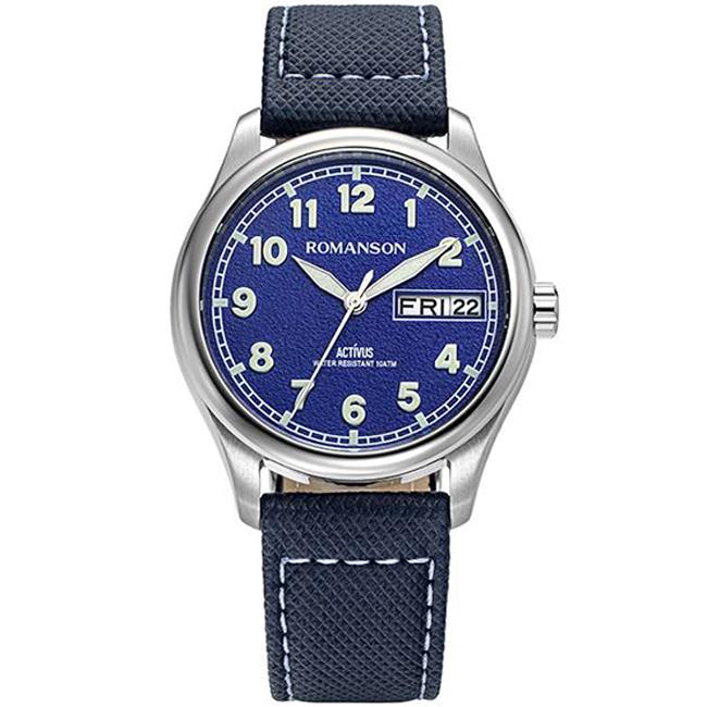 ساعت مچی مردانه رومانسون ROMANSON با طراحی اسپرت بند چرمی سرمه ای با قاب استیل و صفحه گرد سرمه ای با شیشه ضد خراش و موتور سوییسی با انرژی باطری و قابلیت داشتن تقویم / شب نما / روزهای هفته و مقاوم در برابر آب تا عمق 100 متر به همراه دو سال گارانتی بین المللی