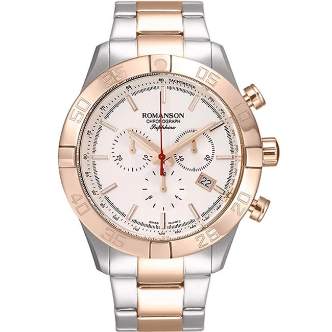 ساعت مچی مردانه رومانسون ROMANSON با طراحی اسپرت بند استیل مسی با قاب مسی استیل و صفحه گرد نقره ای با شیشه ضد خراش و موتور سوییسی با انرژی باطری و قابلیت داشتن تقویم / شب نما / زه تاچی متر / کرنوگراف و مقاوم در برابر آب تا عمق 30 متر به همراه دو سال گارانتی بین المللی