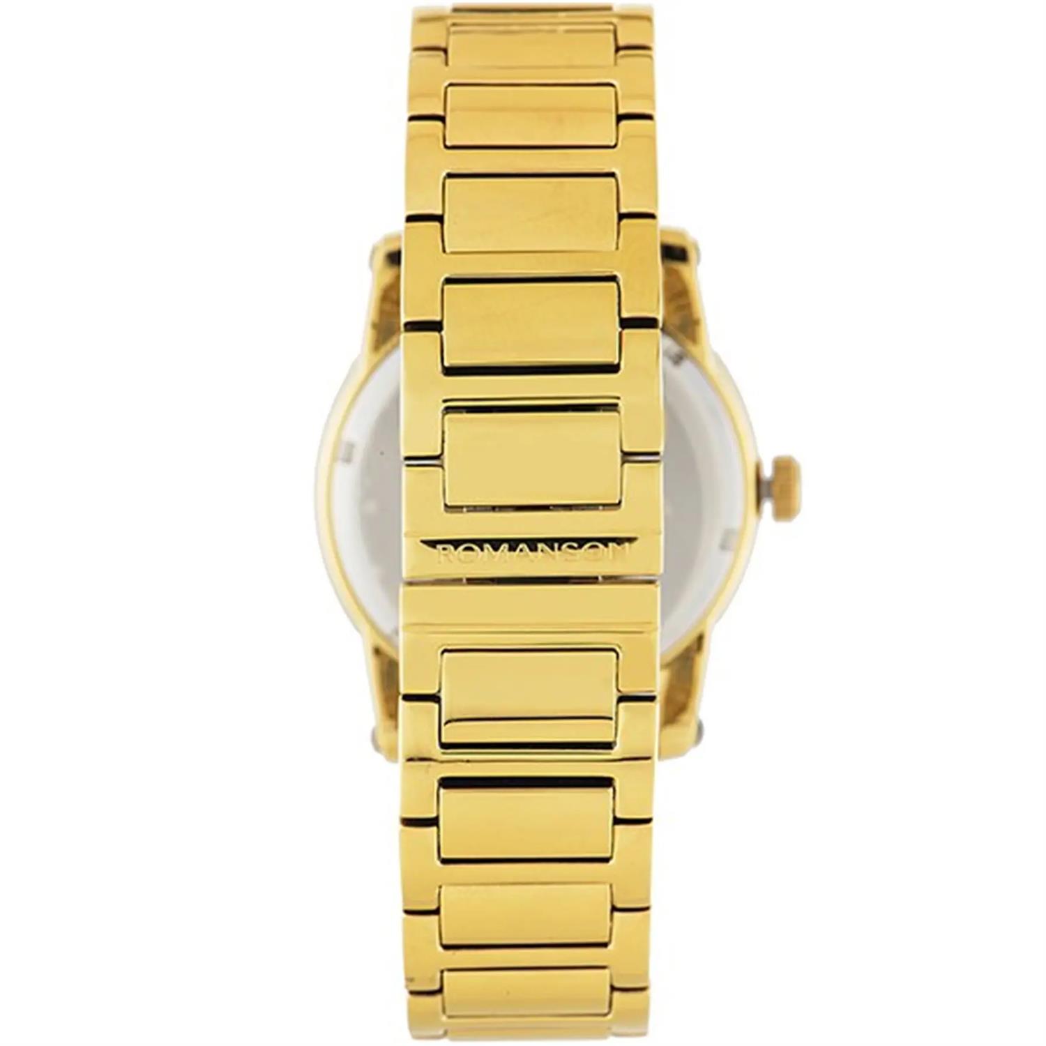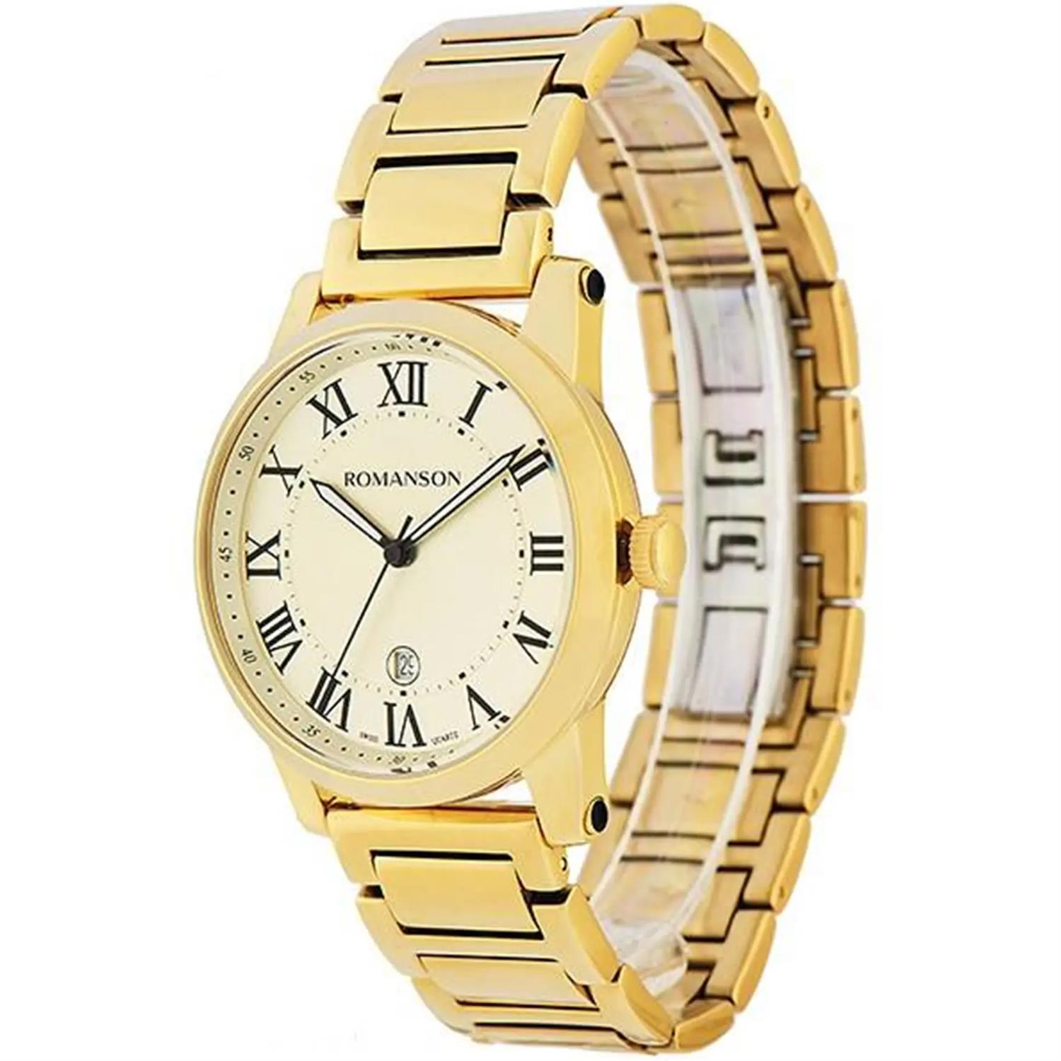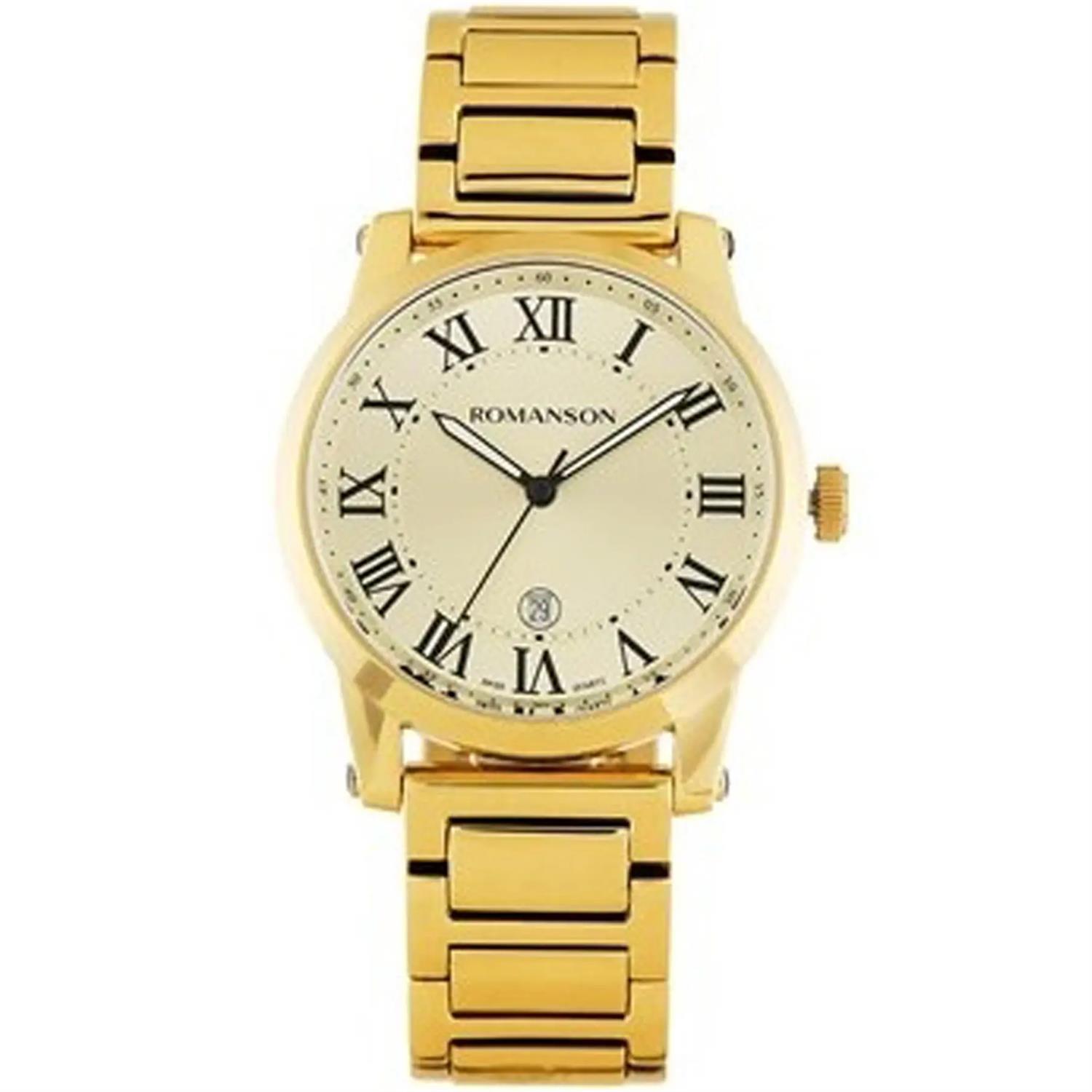ساعت مچی مردانه رومانسون ROMANSON با طراحی روزانه بند فلزی طلایی با قاب فلزی طلایی و صفحه گرد کرم با قابلیت داشتن تقویم . شب نما و موتور سوییسی با انرژی باطری و مقاوم در برابر آب تا عمق 30 متر به همراه دو سال گارانتی بین المللی