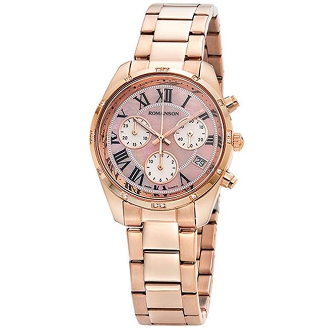 ساعت مچی زنانه رومانسون ROMANSON با طراحی روزانه بند استیل با قاب دور نگین استیل و صفحه صورتی با قابلیت داشتن تقویم / کرنوگراف و موتور سوییسی با انرژی باطری و مقاوم در برابر آب تا عمق 50 متر به همراه دو سال گارانتی بین المللی