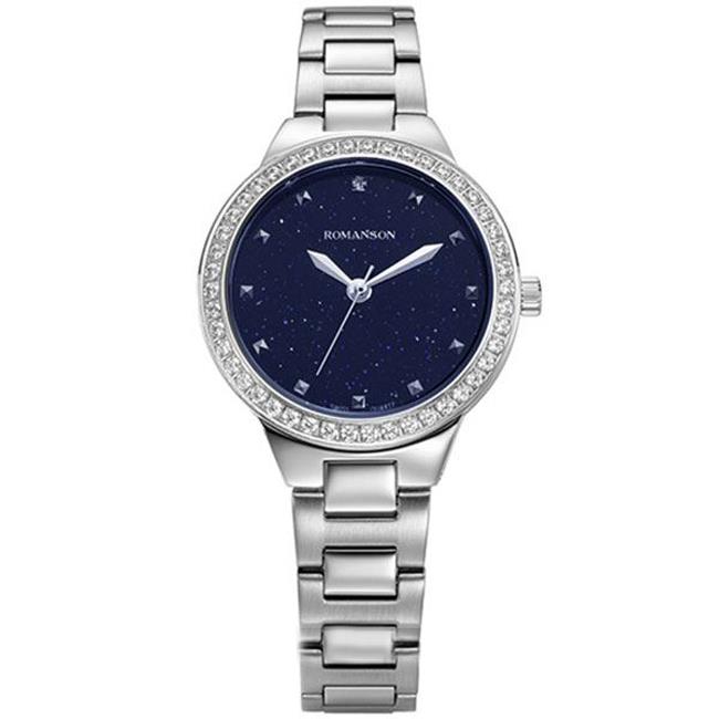 ساعت مچی زنانه رومانسون ROMANSON با طراحی روزانه بند استیل با قاب دور نگین استیل و صفحه سرمه ای و موتور سوییسی با انرژی باطری و مقاوم در برابر آب تا عمق 30 متر به همراه دو سال گارانتی بین المللی