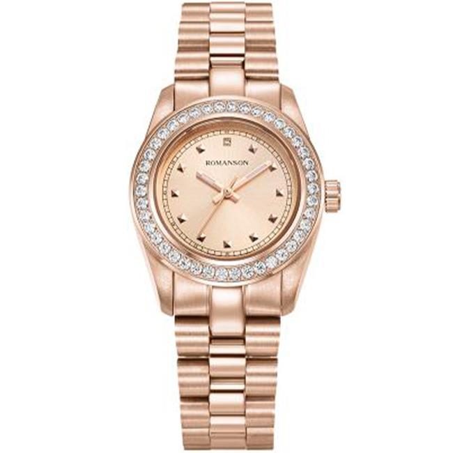 ساعت مچی زنانه رومانسون ROMANSON با طراحی روزانه بند فلزی مسی با قاب نگین دار مسی و صفحه گرد مسی و موتور سوییسی با انرژی باطری و مقاوم در برابر آب تا عمق 50 متر به همراه دو سال گارانتی بین المللی