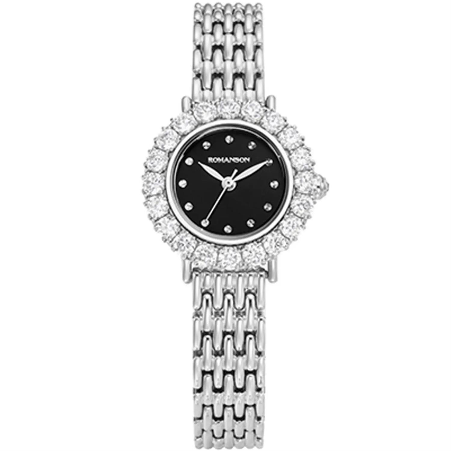 ساعت مچی زنانه رومانسون ROMANSON با طراحی روزانه بند استیل با قاب نگین داراستیل و صفحه مشکی نگین دار و موتور سوییسی با انرژی باطری و مقاوم در برابر آب تا عمق 30 متر به همراه دو سال گارانتی بین المللی