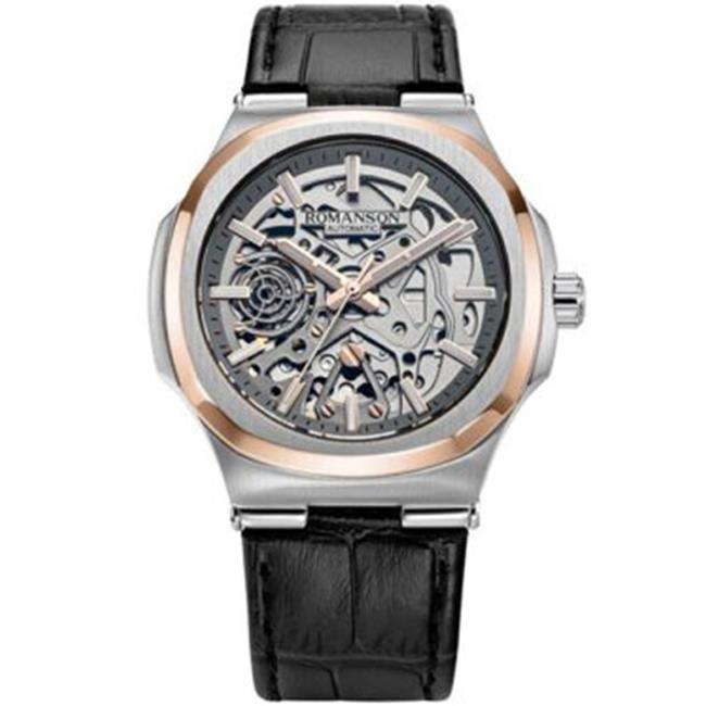 ساعت مچی مردانه رومانسون ROMANSON با طراحی اسپرت بند چرمی مشکی با قاب مسی استیل و صفحه اسکلتون طوسی با شیشه ضد خراش و موتور اتوماتیک با انرژی مکانیکی / قابلیت داشتن شب نما و مقاوم در برابر آب تا عمق 50 متر به همراه دو سال گارانتی بین المللی