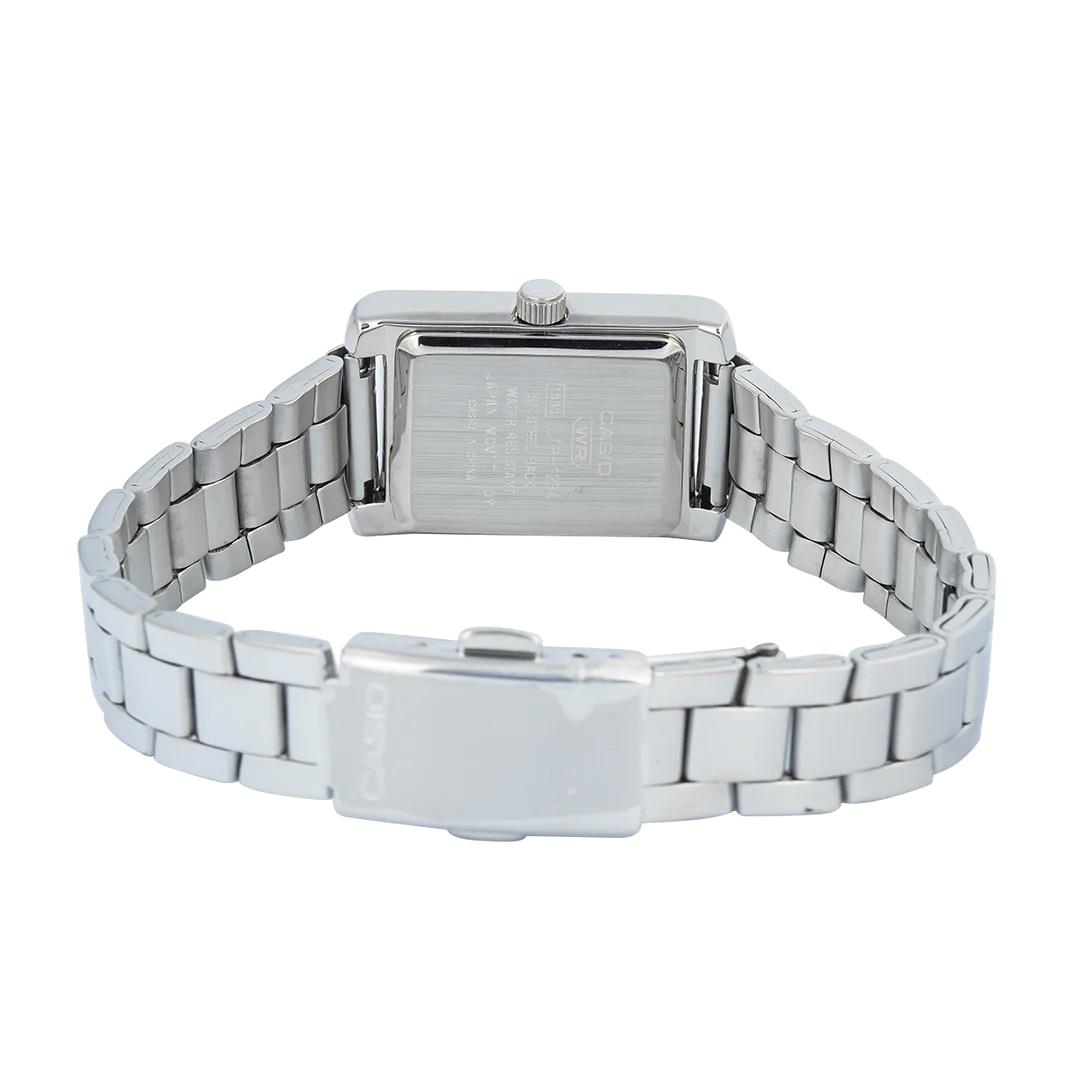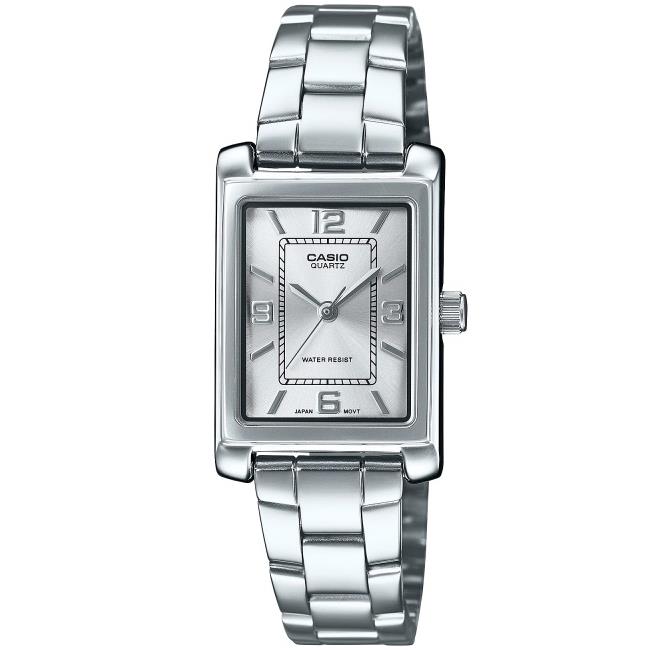 ساعت مچی زنانه کاسیو casio با طراحی روزانه بند استیل با قاب مستطیلی نقره ای و صفحه نقره ای و موتور ژاپنی با انرژی باتری و مقاوم در برابر آب تا عمق 30 متر به همراه گارانتی بین المللی