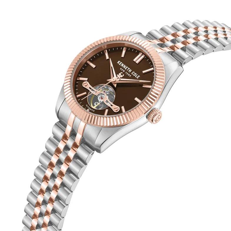 ساعت مچی مردانه کنت کول kenneth cole  با طراحی اسپرت بند استیل مسی و قاب استیل مسی با صفحه ی قلب باز قهوه ای و موتور اتوماتیک ژاپنی با انرژی مکانیکی و مقاومت در برابر آب تا عمق 50 متر به همراه دو سال گارانتی بین المللی