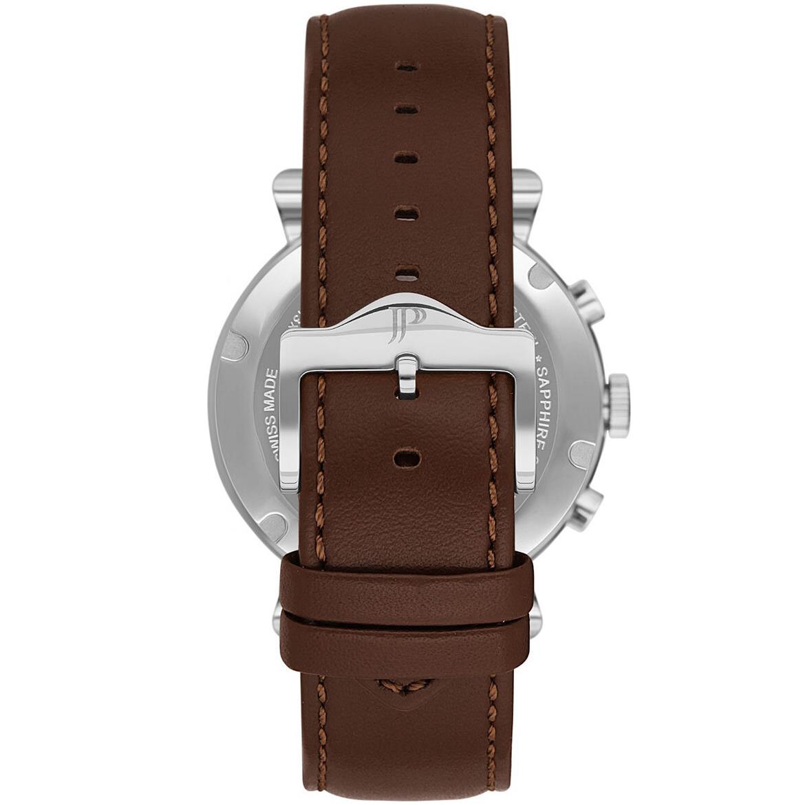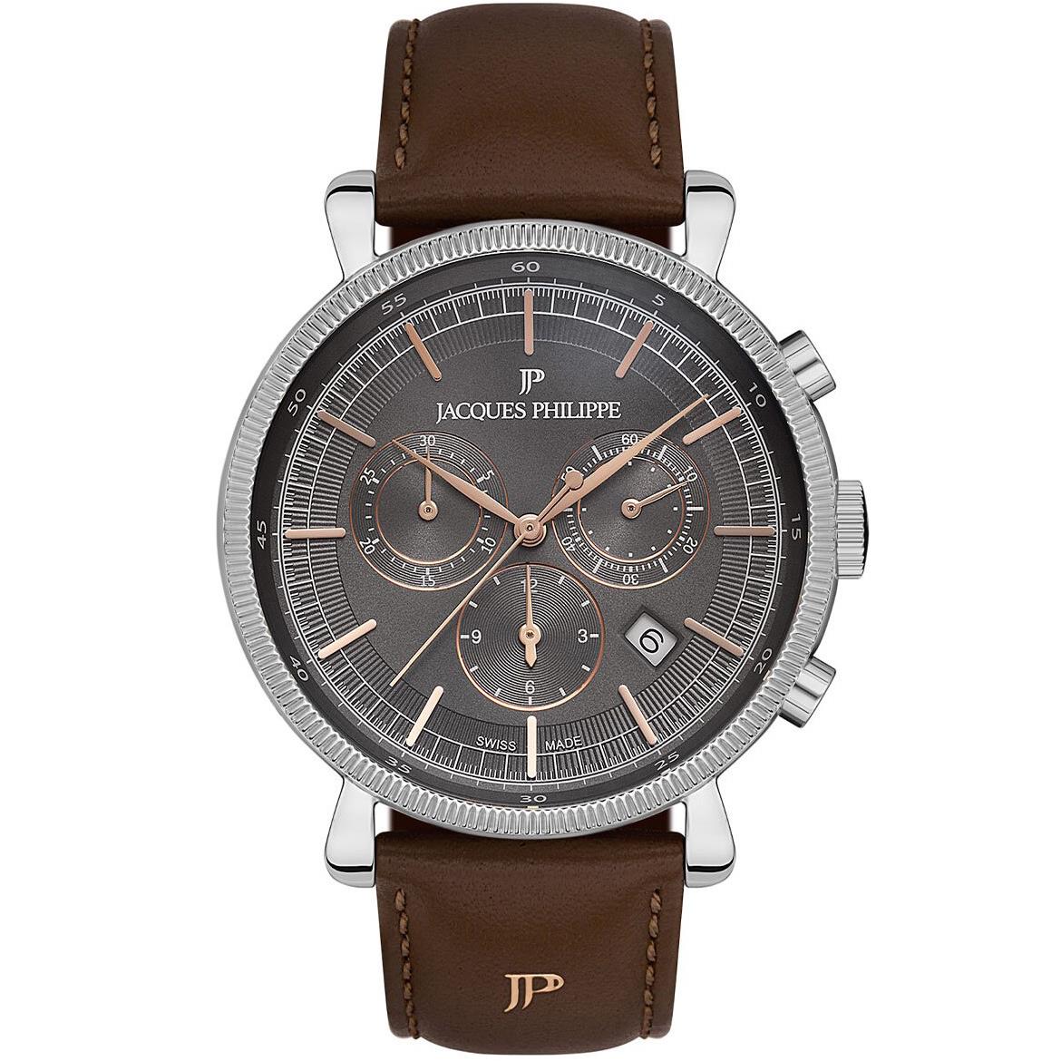 ساعت مچی مردانه ژاک فیلیپ jacques philippe با طراحی روزانه بند چرمی قهوه ای و قاب استیل و صفحه گرد طوسی با شیشه ضد خراش و قابلیت داشتن تقویم / کرنوگراف با موتور سوییسی و انرژی باتری و مقاوم در برابر آب تا عمق 50 متر به همراه گارانتی بین المللی