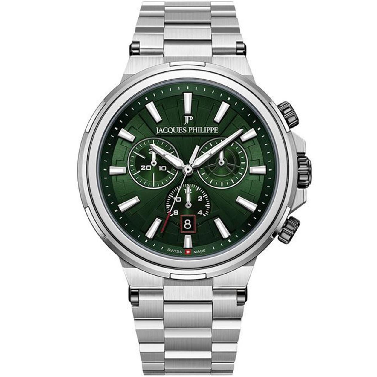 ساعت مچی مردانه ژاک فیلیپ jacques philippe با طراحی روزانه بند استیل و قاب استیل و صفحه گرد سبز با شیشه ضد خراش و قابلیت داشتن تقویم / شب نما / کرنوگراف با موتور سوییسی و انرژی باتری و مقاوم در برابر آب تا عمق 100 متر به همراه گارانتی بین المللی