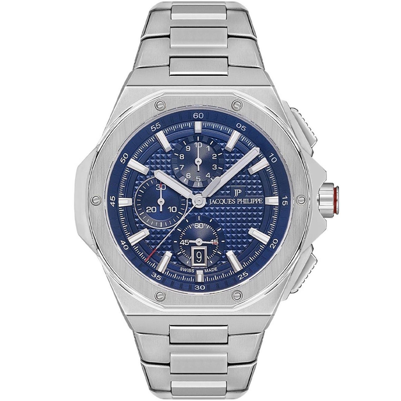 ساعت مچی مردانه ژاک فیلیپ jacques philippe با طراحی روزانه بند استیل و قاب گرد استیل و صفحه گرد سرمه ای با شیشه ضد خراش و قابلیت داشتن تقویم / شبنما / کرنوگراف با موتور سوییسی و انرژی باتری و مقاوم در برابر آب تا عمق 50 متر به همراه گارانتی بین المللی